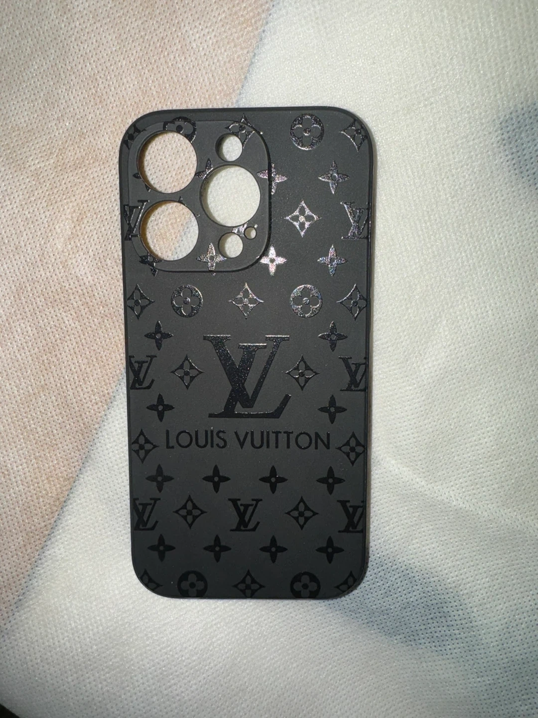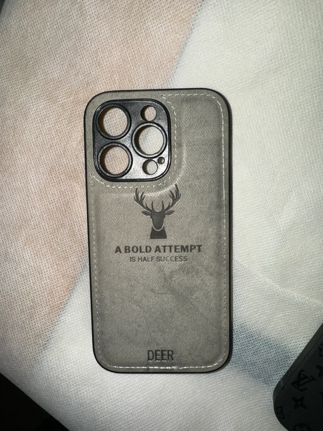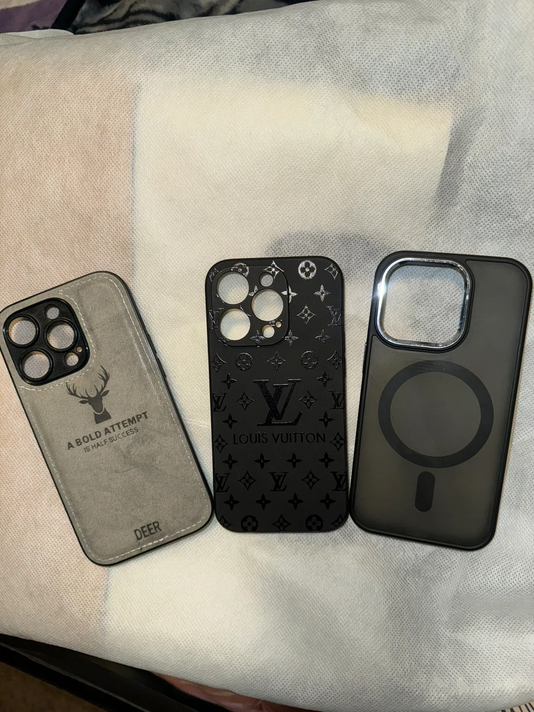 Includes a grey faux leather case with deer graphic and quote, a black Louis Vuitton-style case, and a clear MagSafe compatible case. Protect your phone with these stylish options!