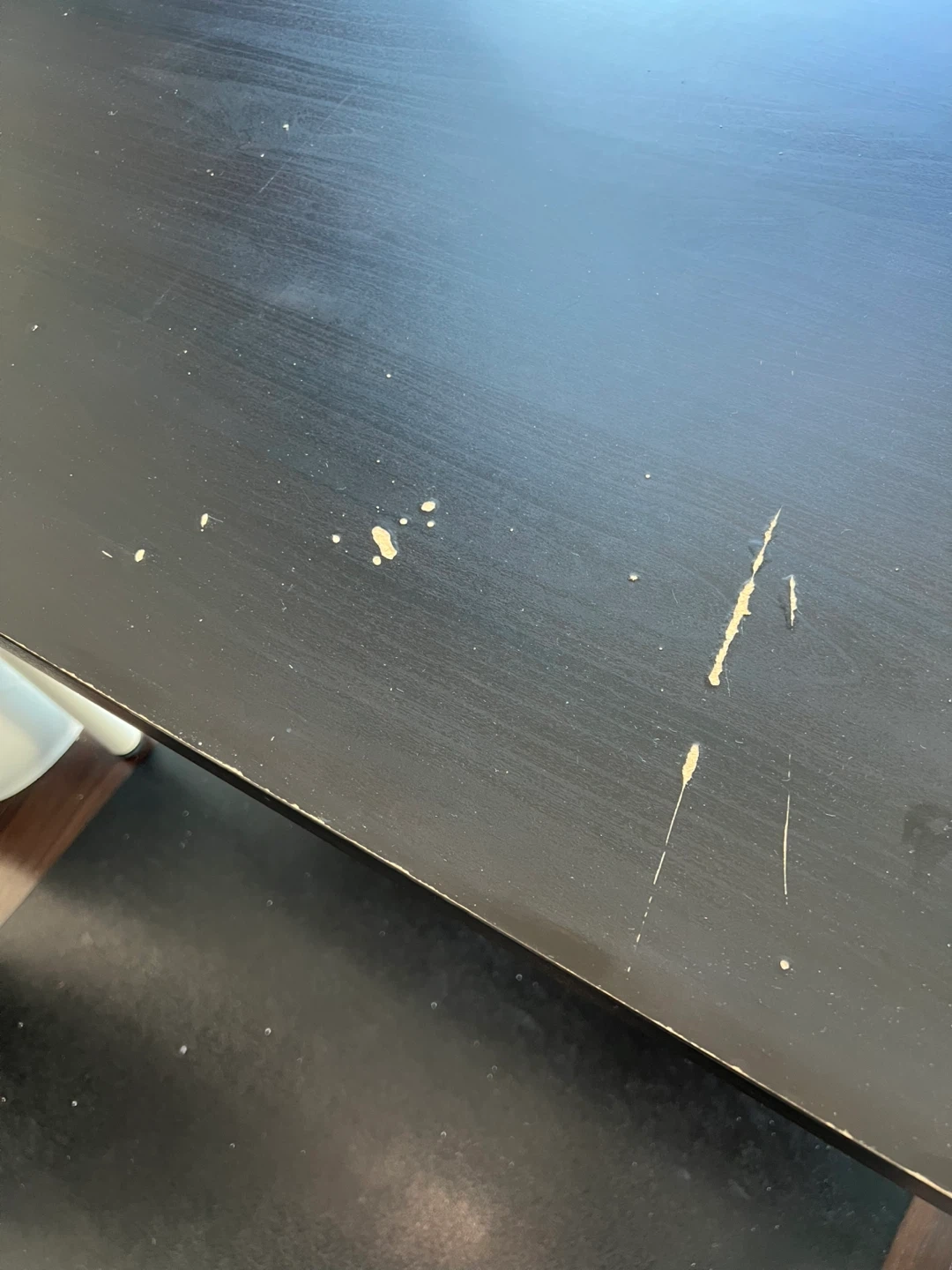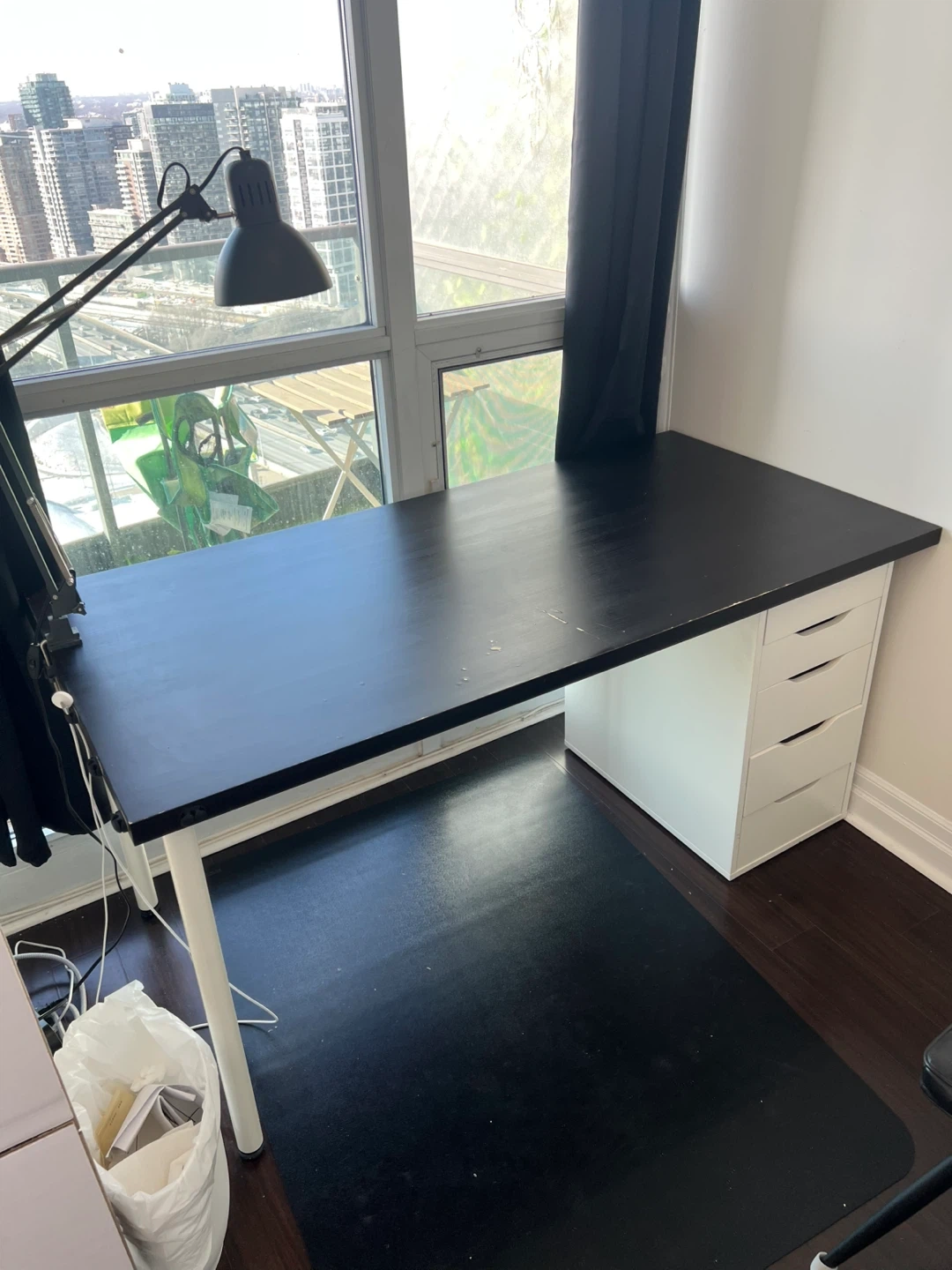 Black desk top paired with a white IKEA Alex drawer unit. Perfect for a home office or study space. Plenty of surface area for your computer and work. Some marks on the desk surface.