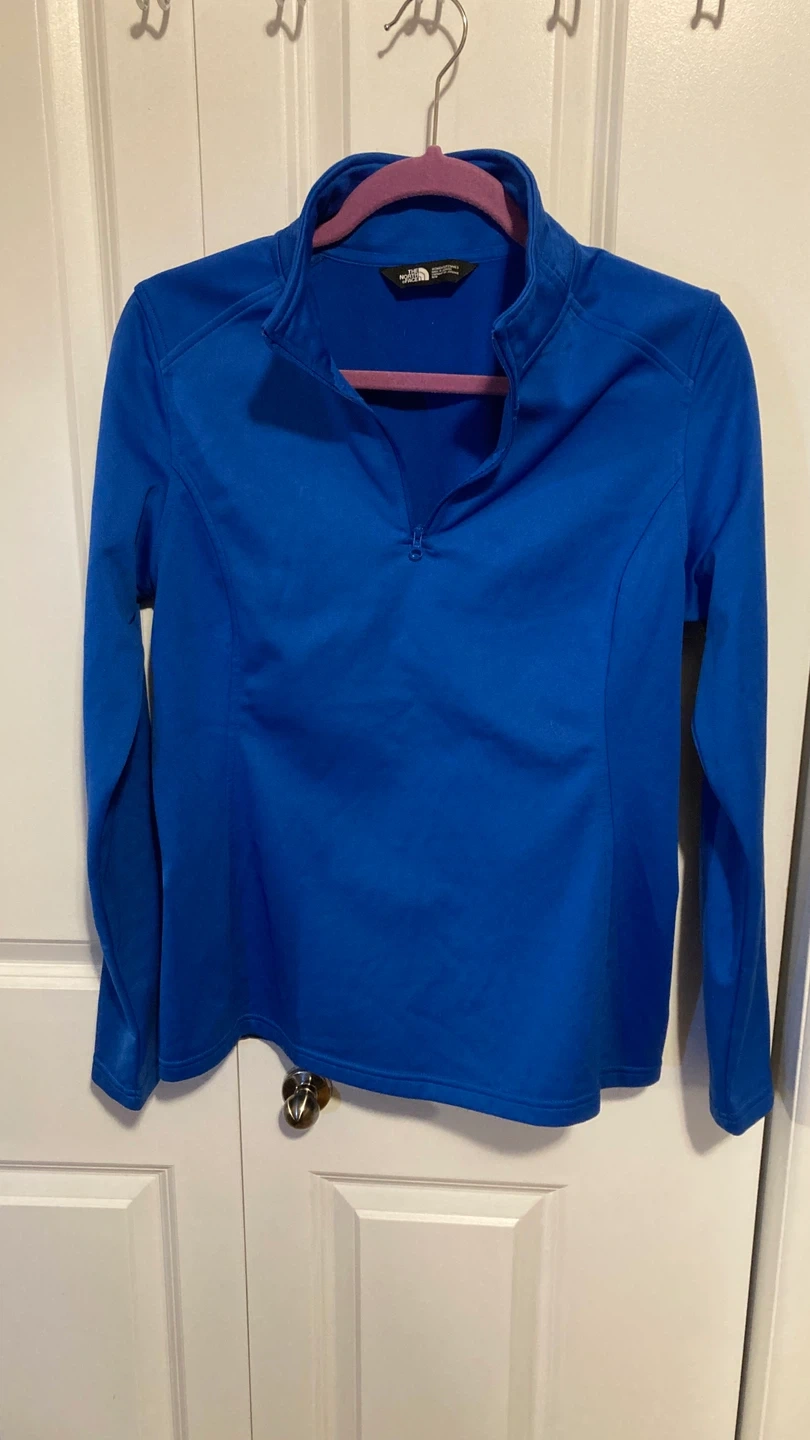 This is a women’s 1/4 zip blue The North Face pullover. It's perfect for layering on cooler days!