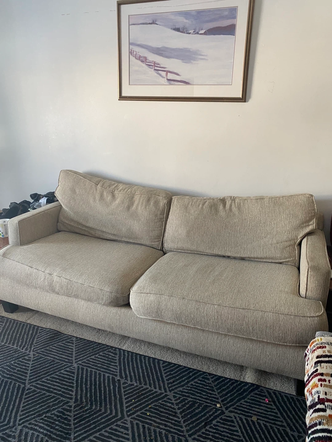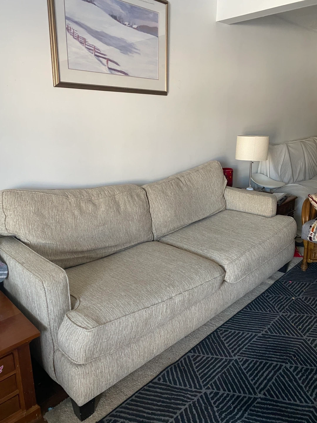 This is a comfortable beige loveseat sofa. It's upholstered in a textured fabric. The sofa has two seat cushions and two back cushions.