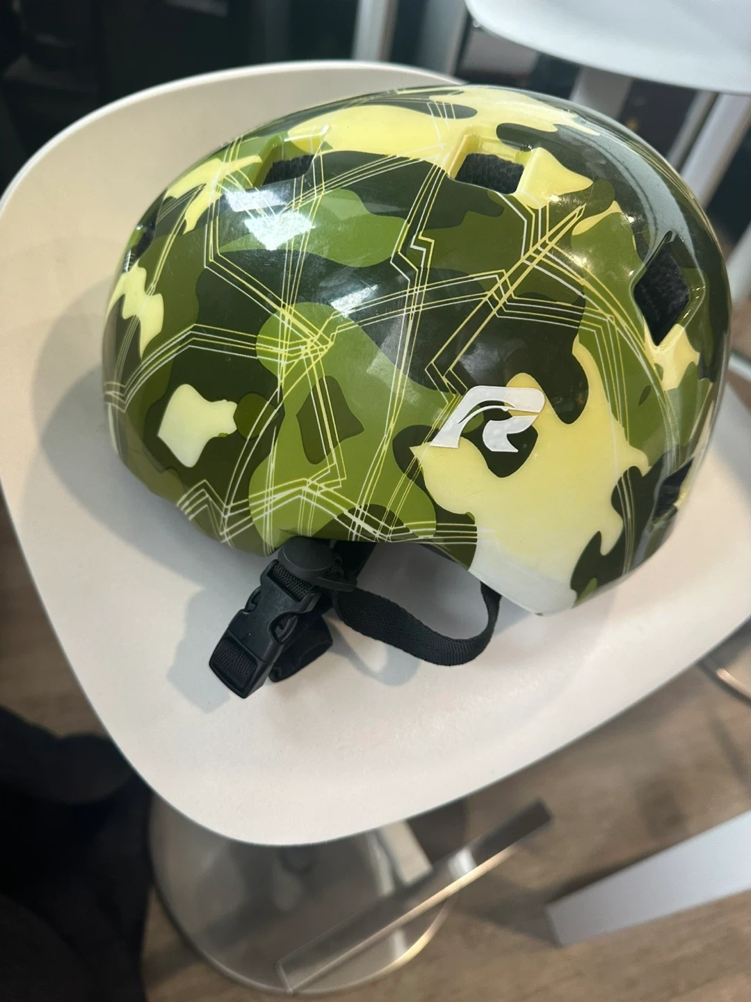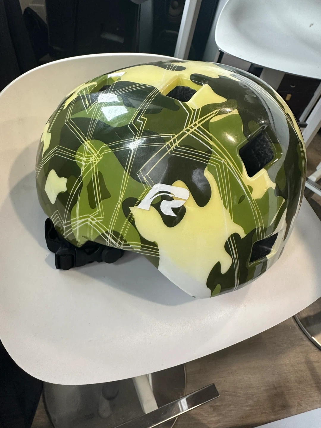 This Ride Gear helmet comes in a cool camo design! It's sized for children with a head circumference of 52-56 cm. It's perfect for keeping kids safe while they're biking or riding other gear.