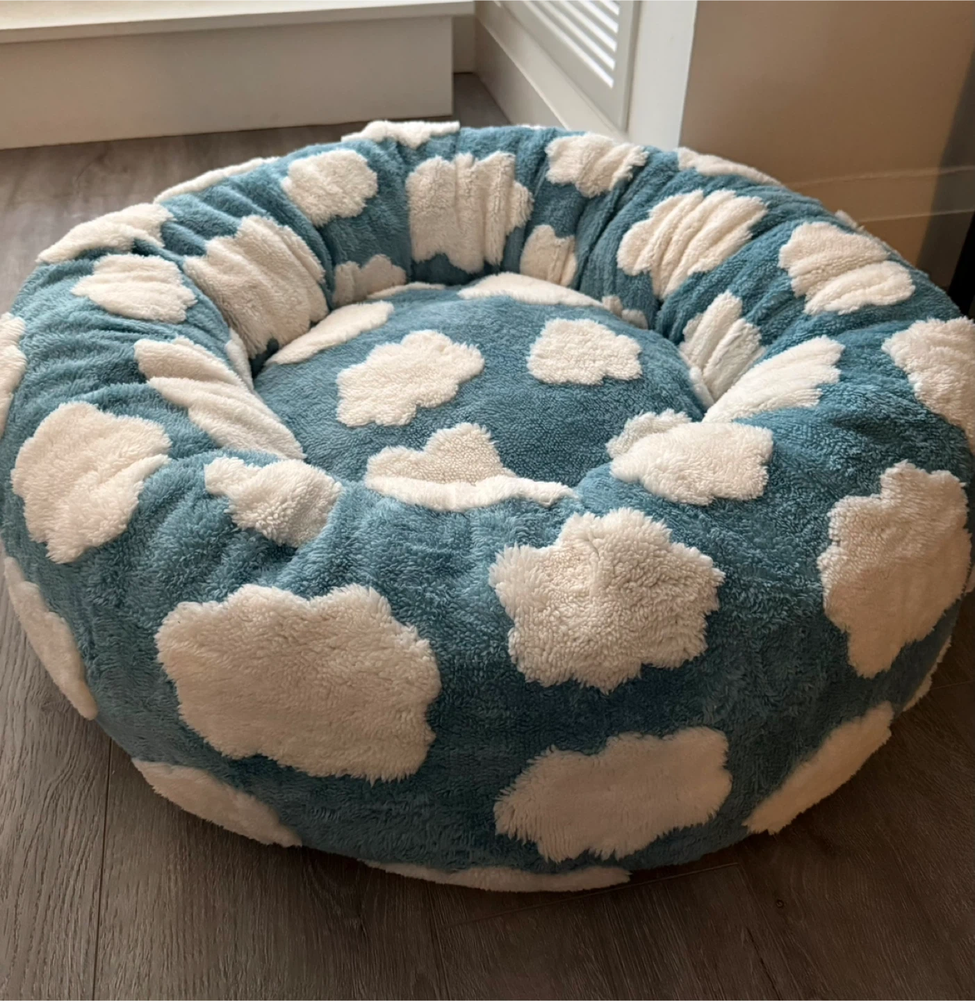 Super soft and comfy plush dog bed with a cute blue-and-white cloud design. Perfect for medium- or small-sized pets to curl up in.