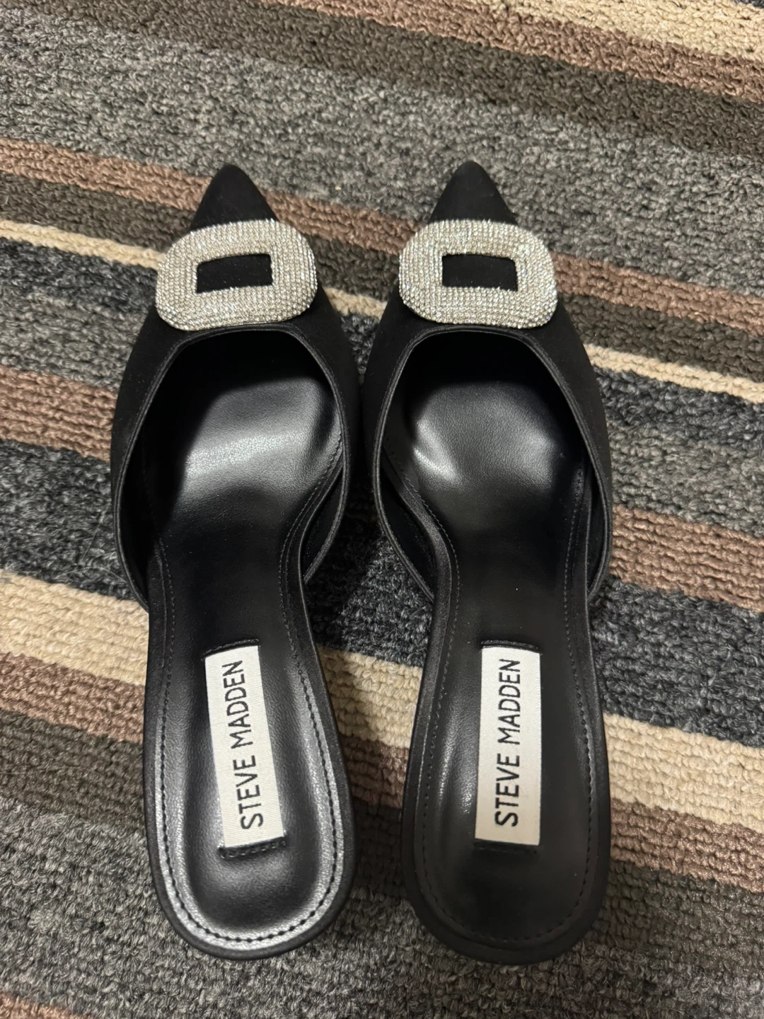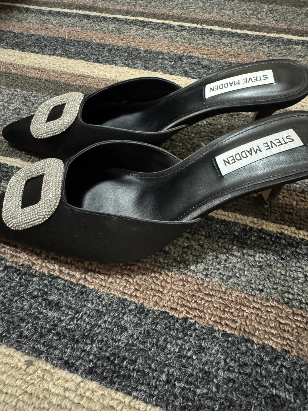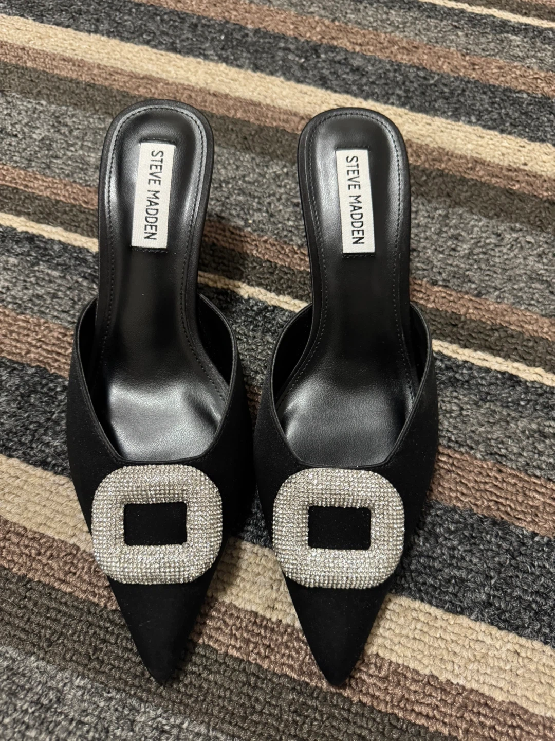 These stylish Steve Madden mules are black with a pointed toe and a decorative rhinestone buckle. Heel height appears to be around 2-3 inches. They're perfect for dressing up any outfit. Only used once. Size 7-7.5