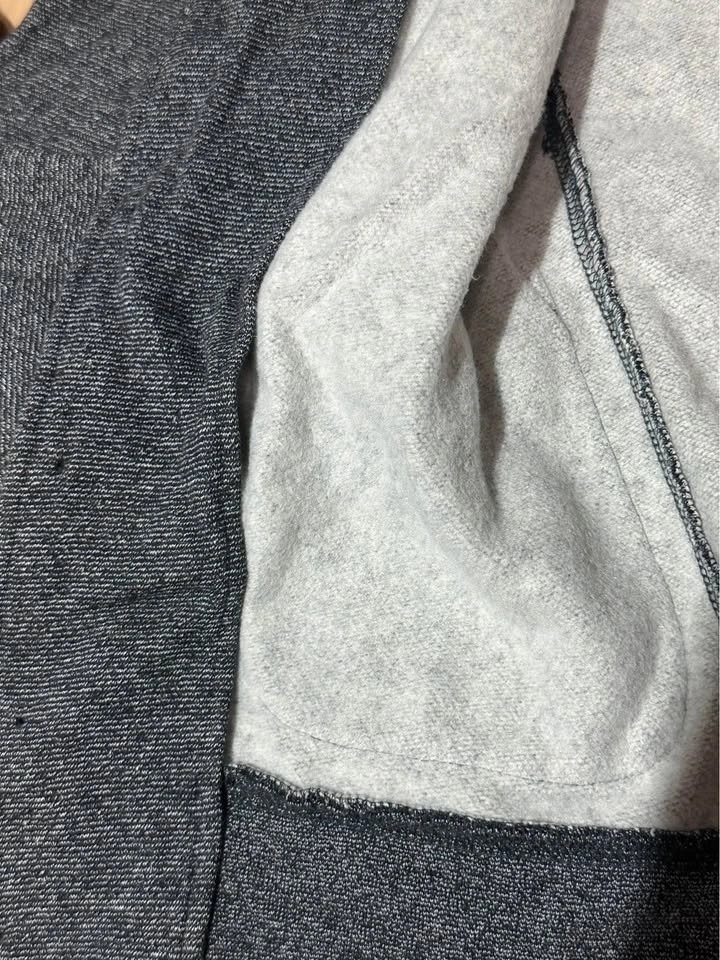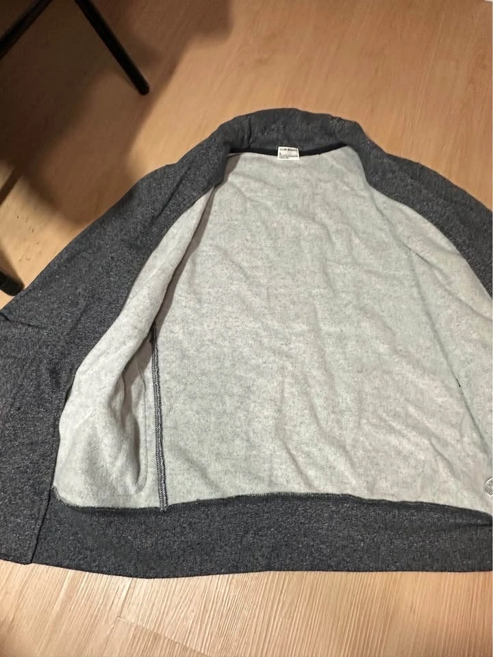 Comfy Club Monaco shawl collar cardigan in a grey heathered color. Features a button front and two front pockets. Size small. Made from 83% cotton and 17% polyester. Measures: Shoulder to shoulder 40cm, Pit to pit 45cm, Length from shoulder 63cm. Located in Midtown Toronto.