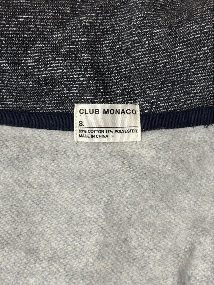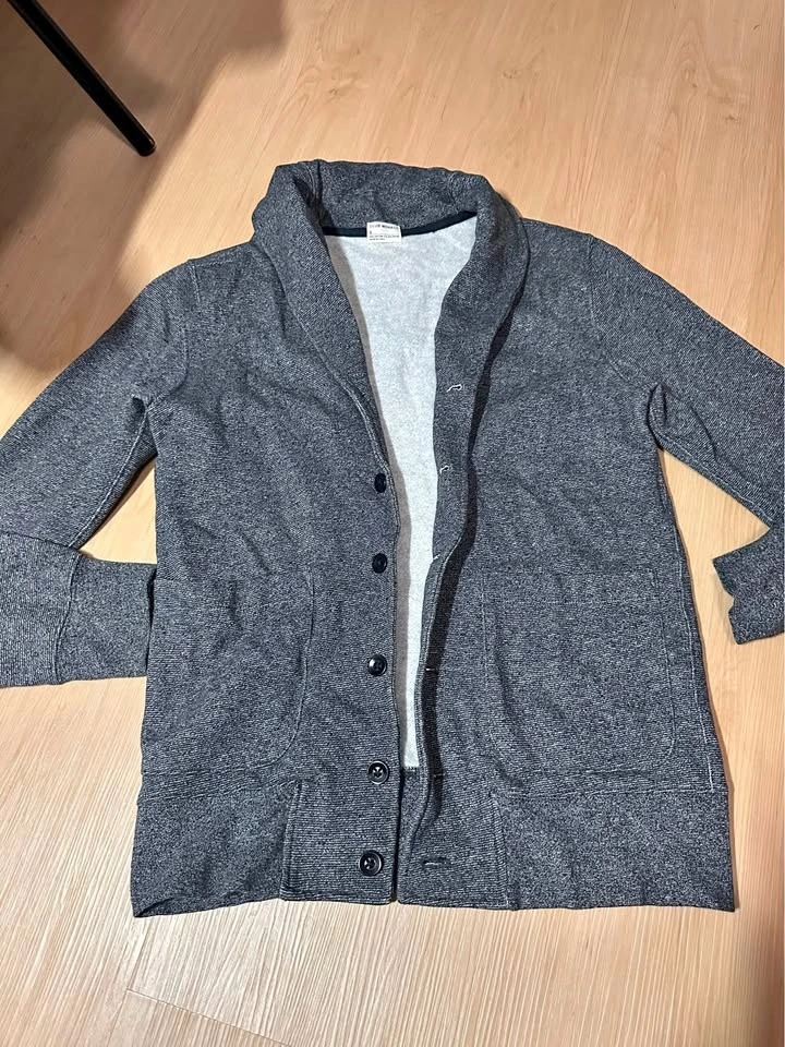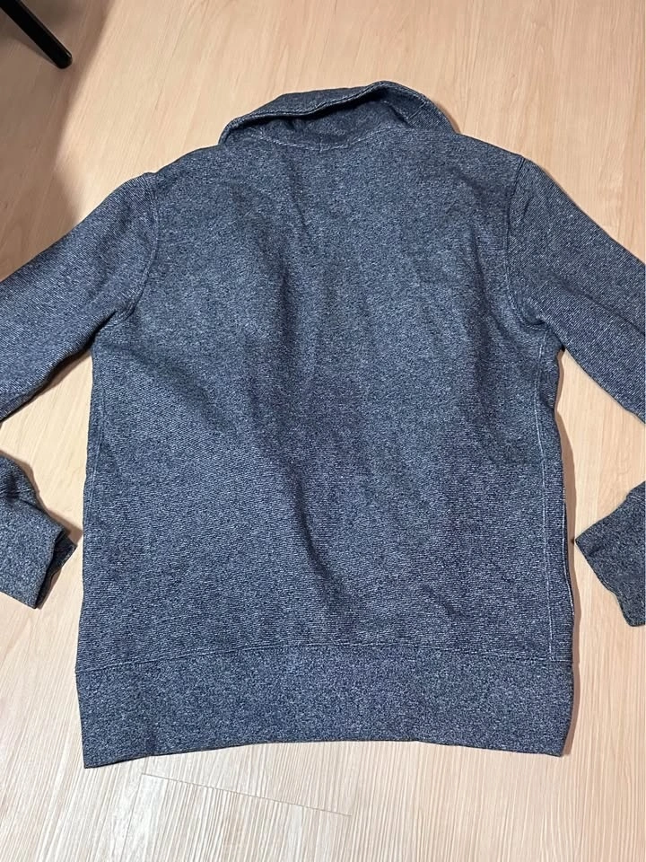 Comfy Club Monaco shawl collar cardigan in a grey heathered color. Features a button front and two front pockets. Size small. Made from 83% cotton and 17% polyester. Measures: Shoulder to shoulder 40cm, Pit to pit 45cm, Length from shoulder 63cm. Located in Midtown Toronto.