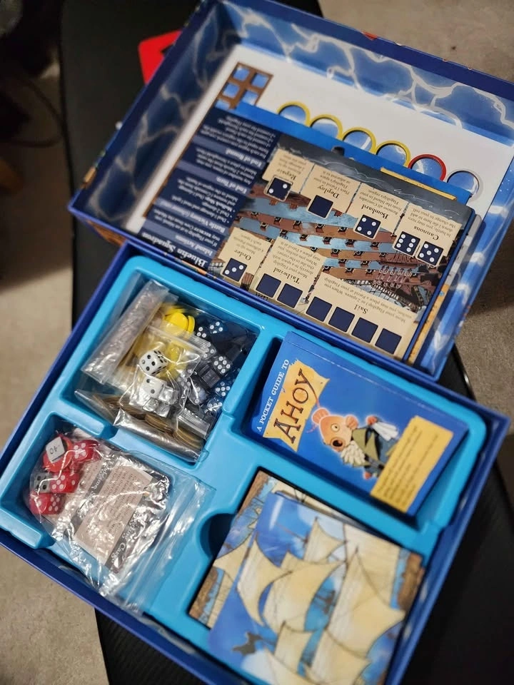 Excellent AHOY board game. Game comes with all components like dice, cards, and a pocket guide. Everything is organized in trays and bags. Only played once.