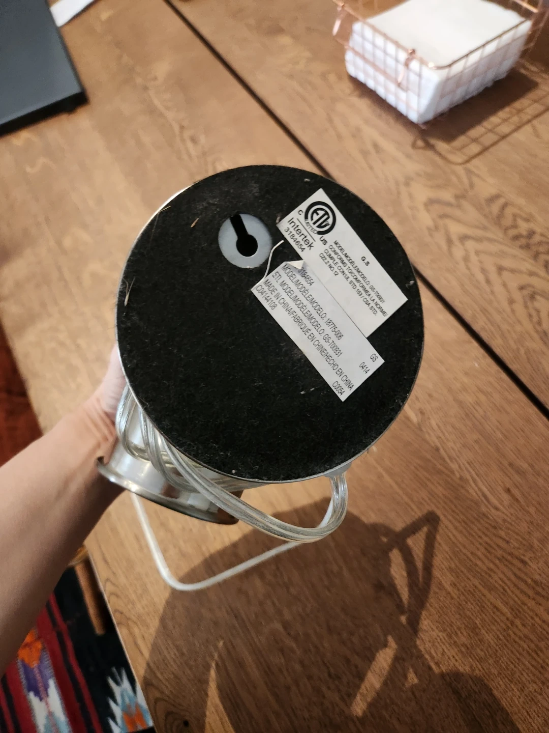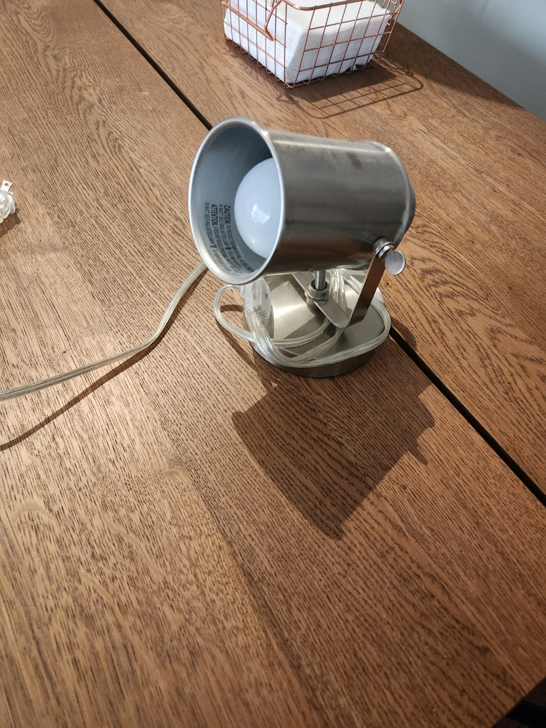 This is a task lamp with a spotlight design. It's made of metal and comes with a power cord and a bulb. Good for illuminating a specific area.