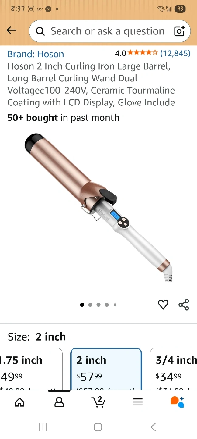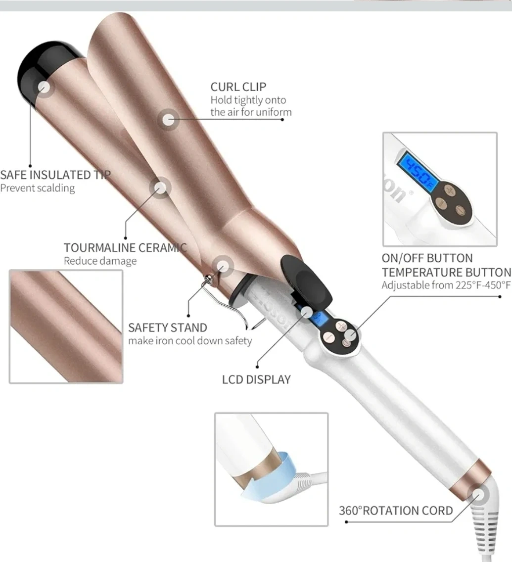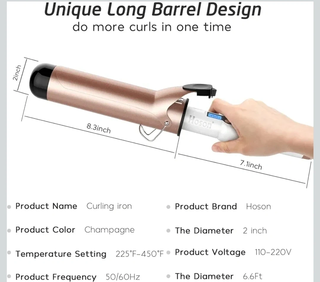This Hoson curling iron has a 2-inch barrel with Tourmaline Ceramic coating. It features an LCD display and adjustable temperature settings from 225°F to 450°F. The cord is 360-degree rotatable. It's perfect for creating large waves on long hair.