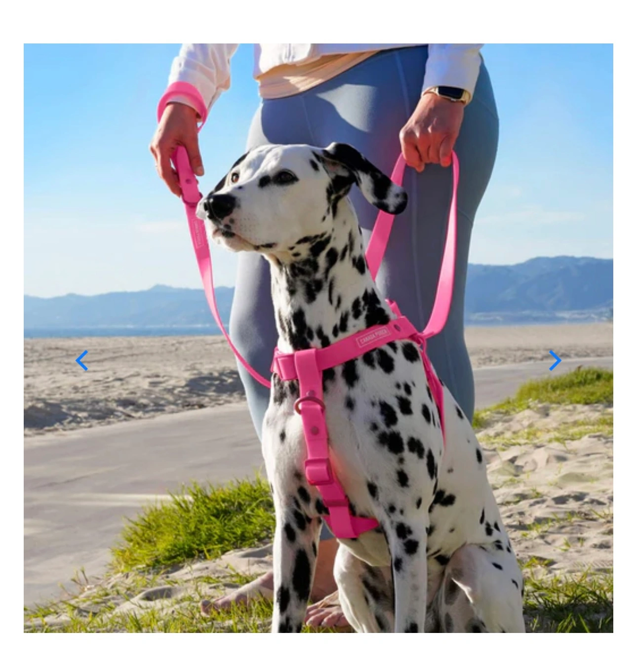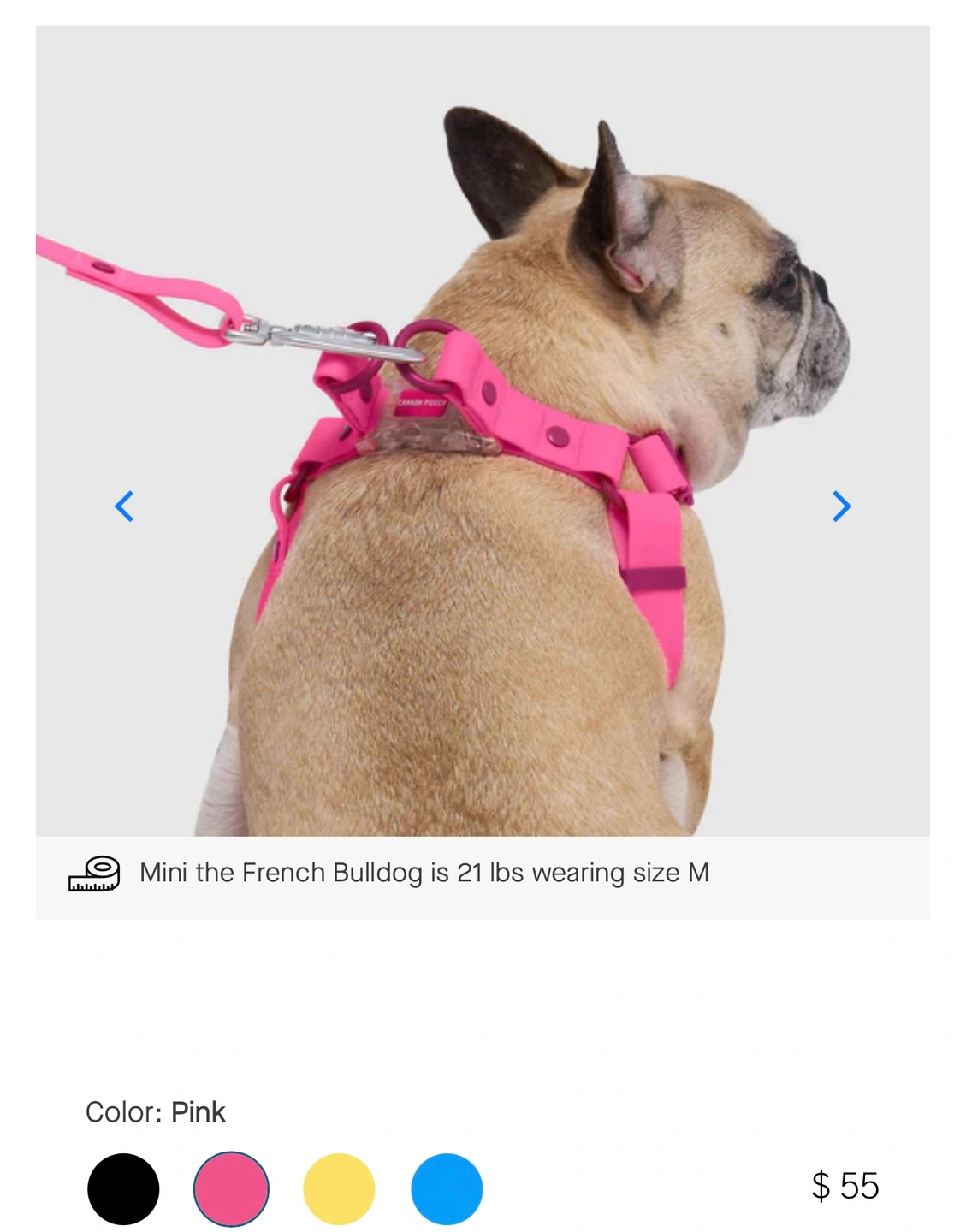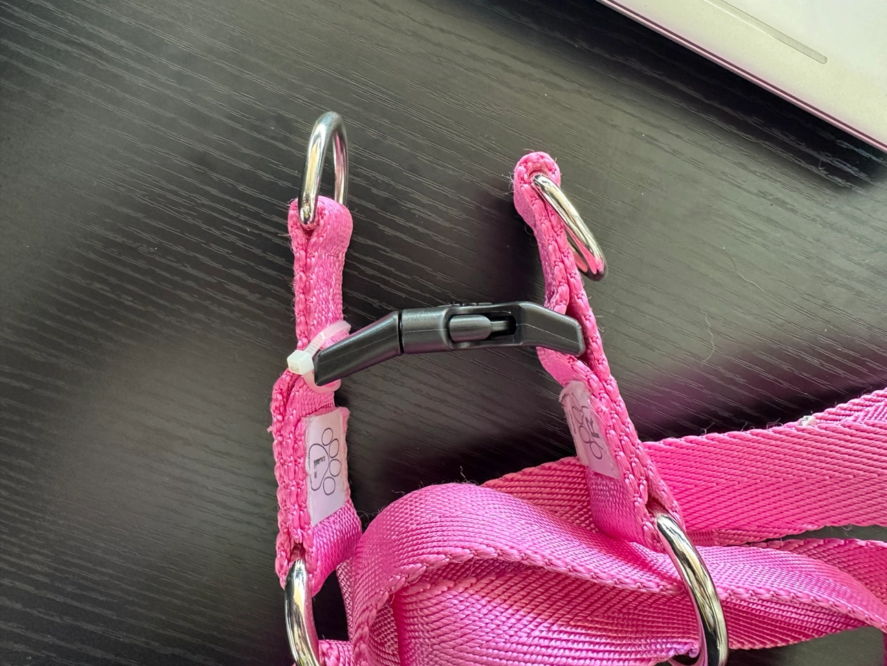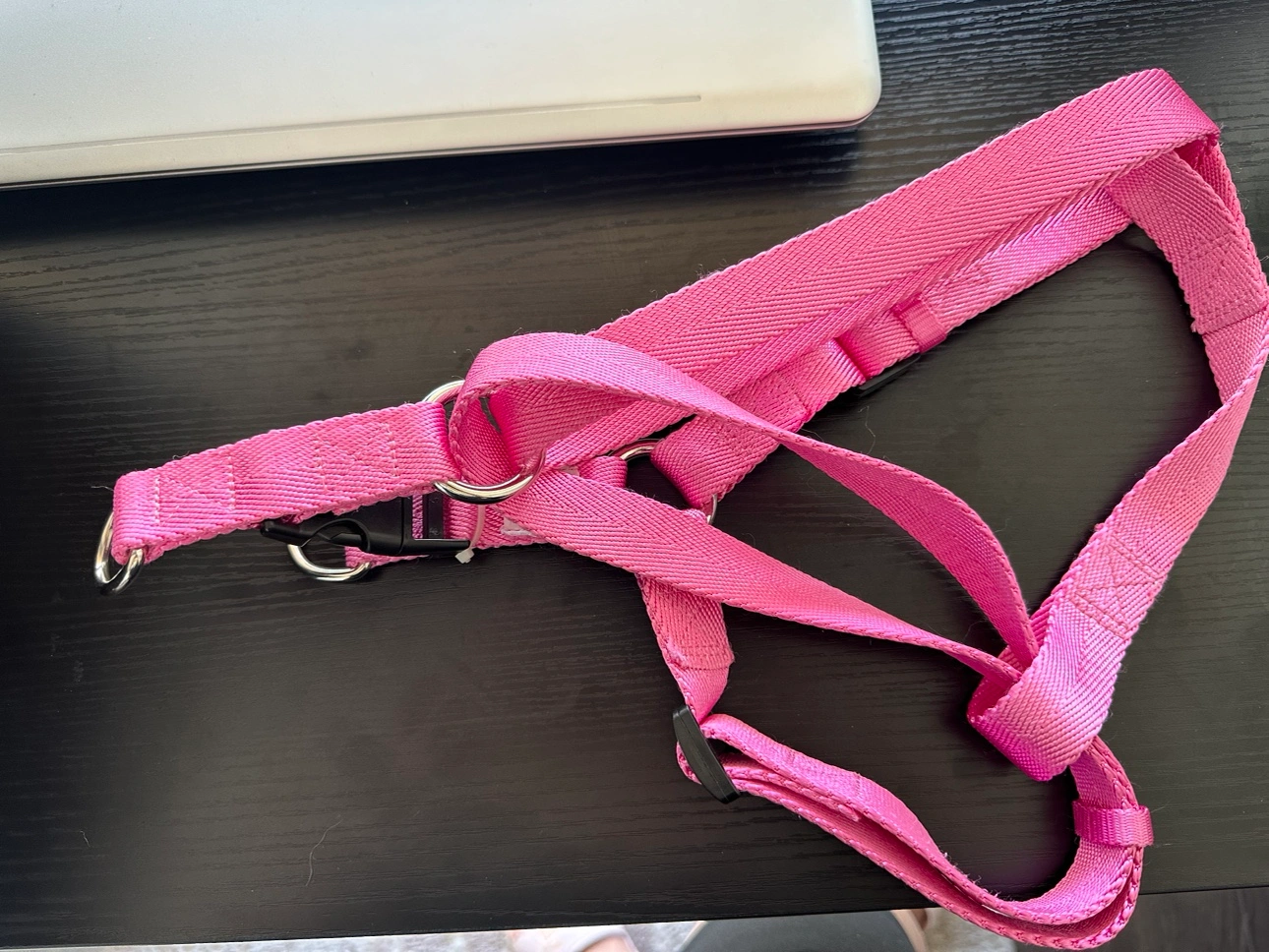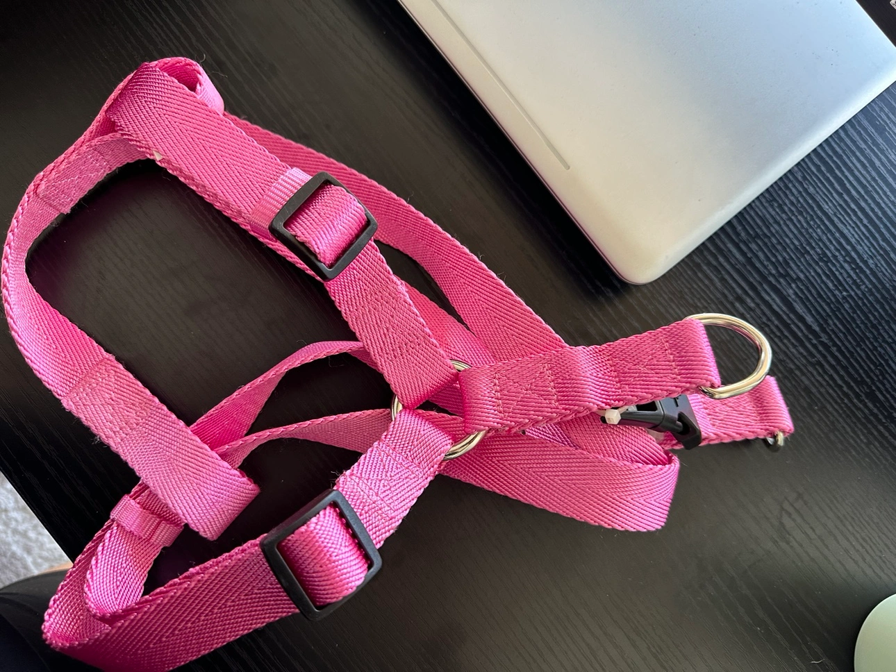 A pink dog harness with adjustable straps and a clip. Dog photos are for reference. I bought it but didn’t fit my dog. It’s L size. I have it in Brentwood Concord but I could deliver in commercial broadway skytrain station or in front of pacific centre mall