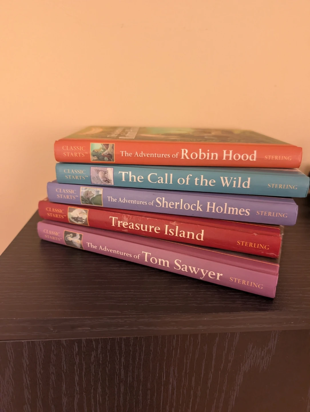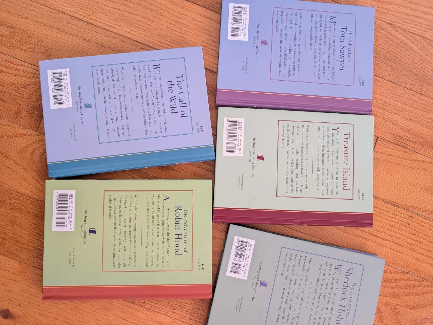 This handsome library features abridged versions of five classic tales for young readers. It includes 'The Adventures of Tom Sawyer', 'Treasure Island', 'The Adventures of Sherlock Holmes', 'The Call of the Wild', and 'The Adventures of Robin Hood'. Each book is abridged for easier reading. These stories are great for introducing kids to timeless literature! Please note, there is a couple of slight damages on few pages, caused by a bit of moisture, but no impact on the pages color or print - please see the last four images.