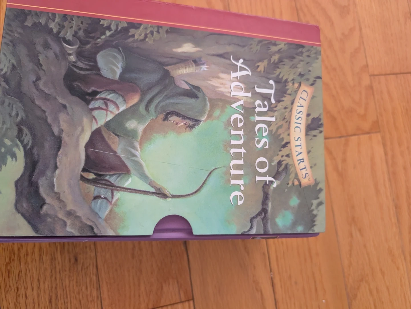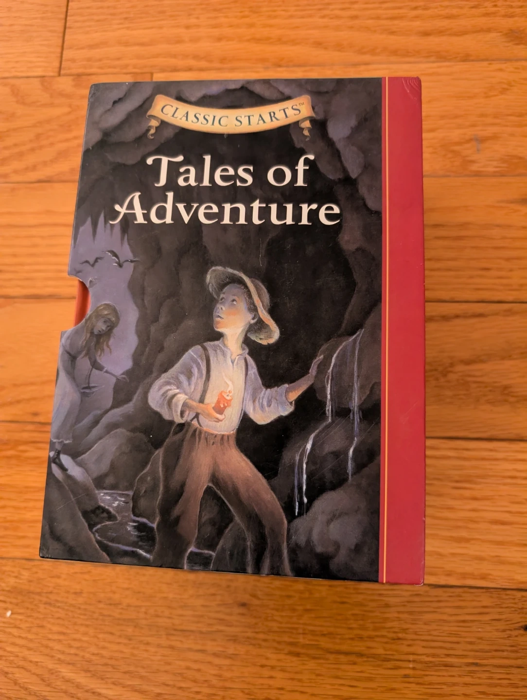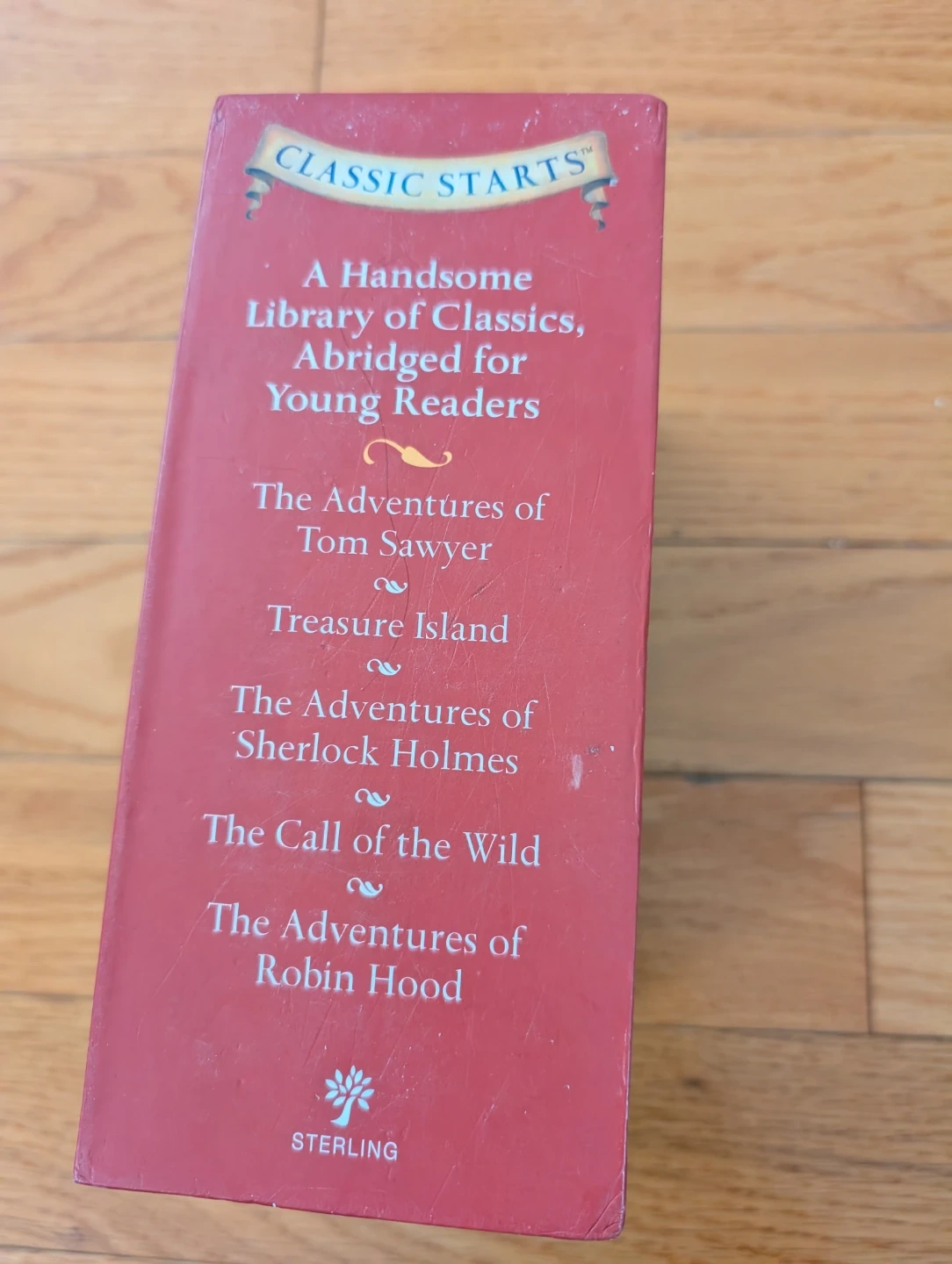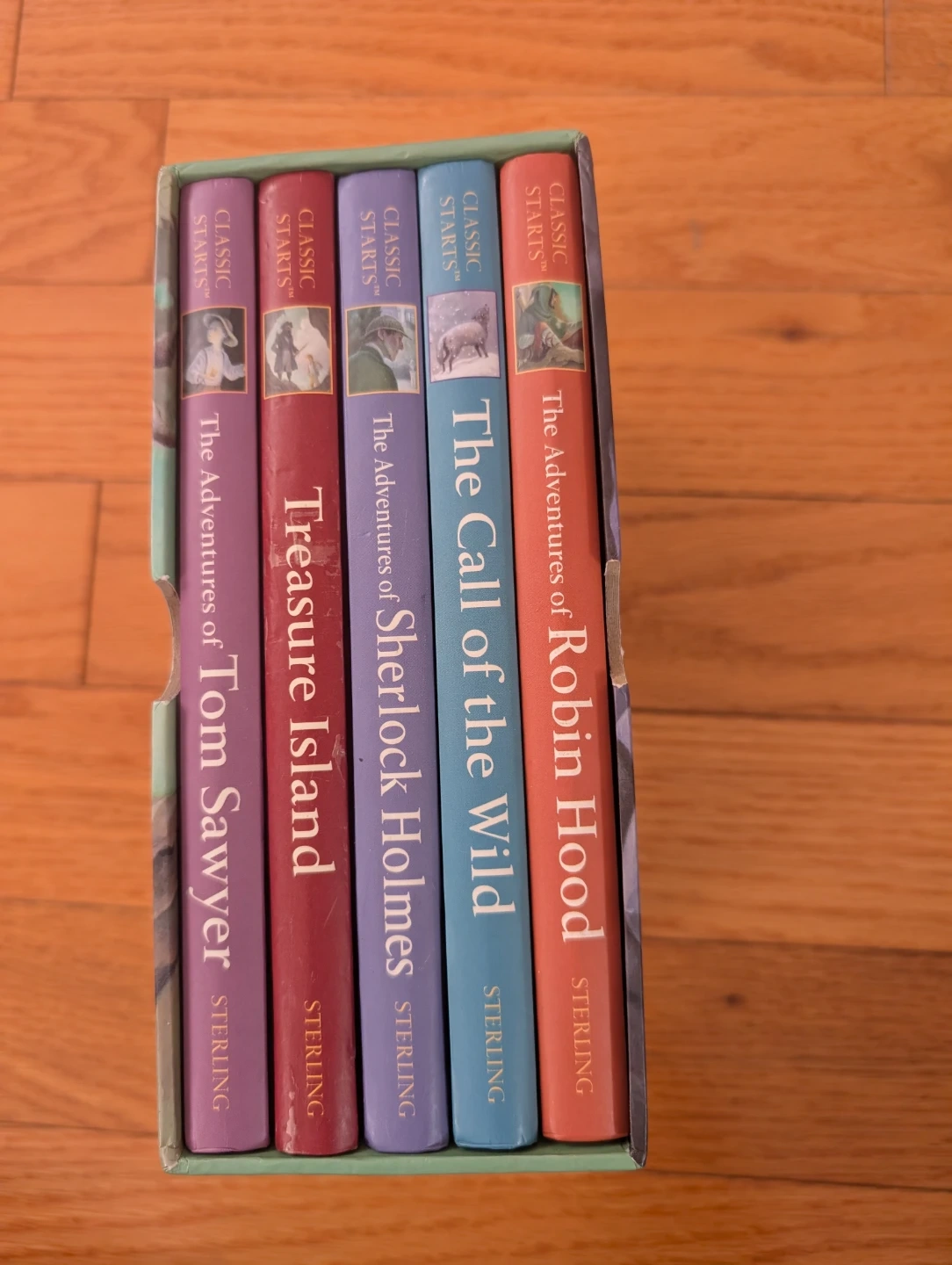 This handsome library features abridged versions of five classic tales for young readers. It includes 'The Adventures of Tom Sawyer', 'Treasure Island', 'The Adventures of Sherlock Holmes', 'The Call of the Wild', and 'The Adventures of Robin Hood'. Each book is abridged for easier reading. These stories are great for introducing kids to timeless literature! Please note, there is a couple of slight damages on few pages, caused by a bit of moisture, but no impact on the pages color or print - please see the last four images.