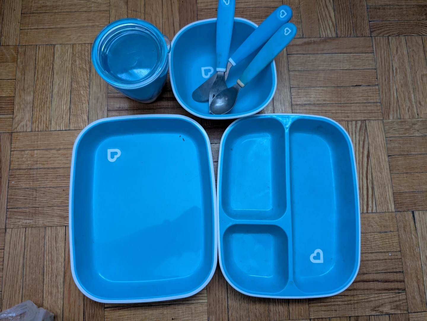 This bright blue Munchkin mealtime set includes a divided plate, a plate with one large section, a bowl, and three utensils. It's designed for little ones learning to self-feed. The utensils are sized for small hands.