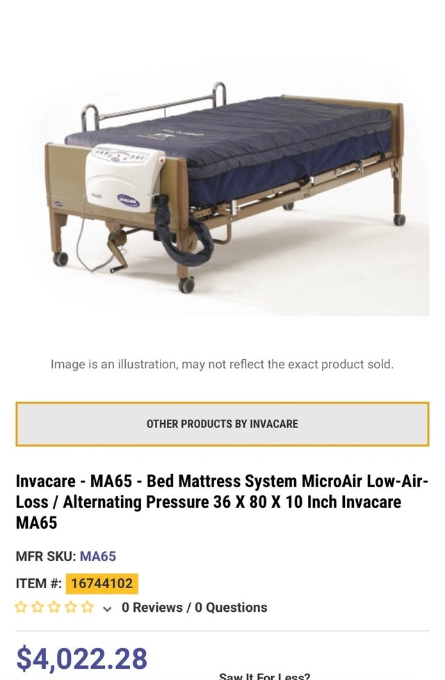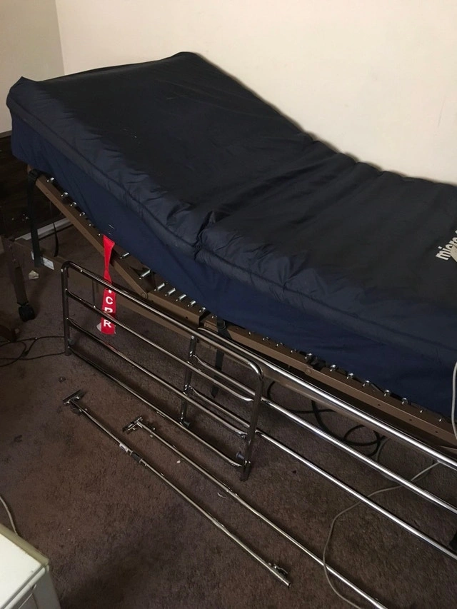 The Invacare Micro Air MA65 therapeutic support system improves air circulation and cools body temperature. This MA65 mattress is an alternating pressure with on-demand low air loss mattress replacement system that aids in the prevention and treatment of pressure ulcers. Mattress is $800. Invacare bed is fully adjustable with a six-button remote, controlling bed height, incline, and knee rest electronically. Message me your phone number and I will send you a video of the bed working over WhatsApp. Mattress only is $800. Bed + Mattress is $1100. Full length or half length rails available! Message me your questions. Delivery/setup is available.