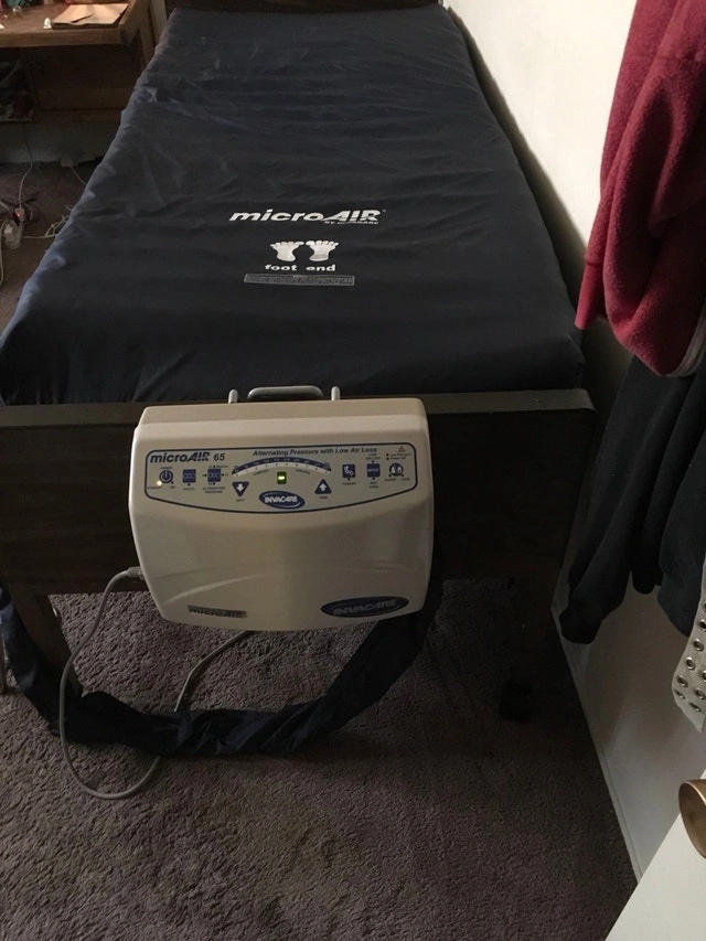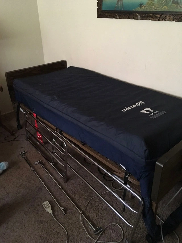 The Invacare Micro Air MA65 therapeutic support system improves air circulation and cools body temperature. This MA65 mattress is an alternating pressure with on-demand low air loss mattress replacement system that aids in the prevention and treatment of pressure ulcers. Mattress is $800. Invacare bed is fully adjustable with a six-button remote, controlling bed height, incline, and knee rest electronically. Message me your phone number and I will send you a video of the bed working over WhatsApp. Mattress only is $800. Bed + Mattress is $1100. Full length or half length rails available! Message me your questions. Delivery/setup is available.