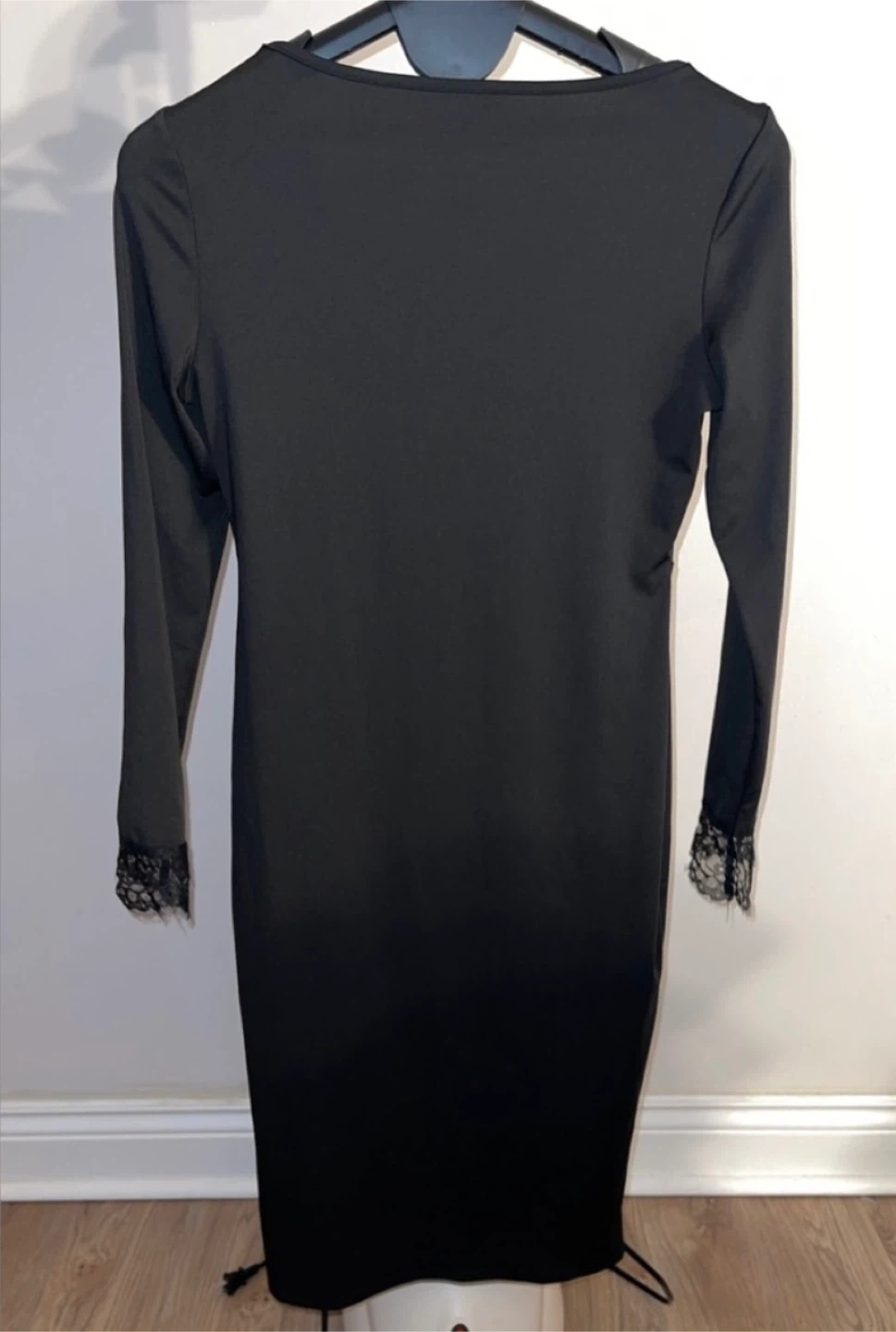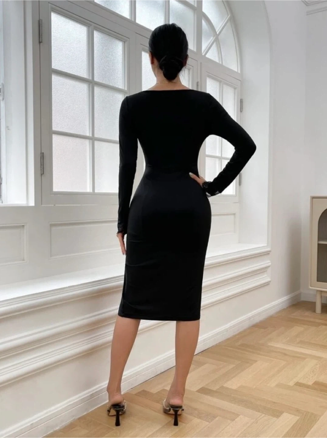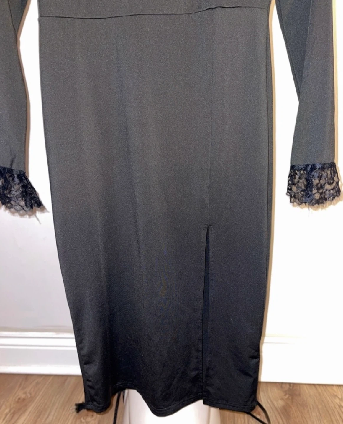 Black Lace Trim Split Thigh Long Sleeve Bodycon Midi Dress