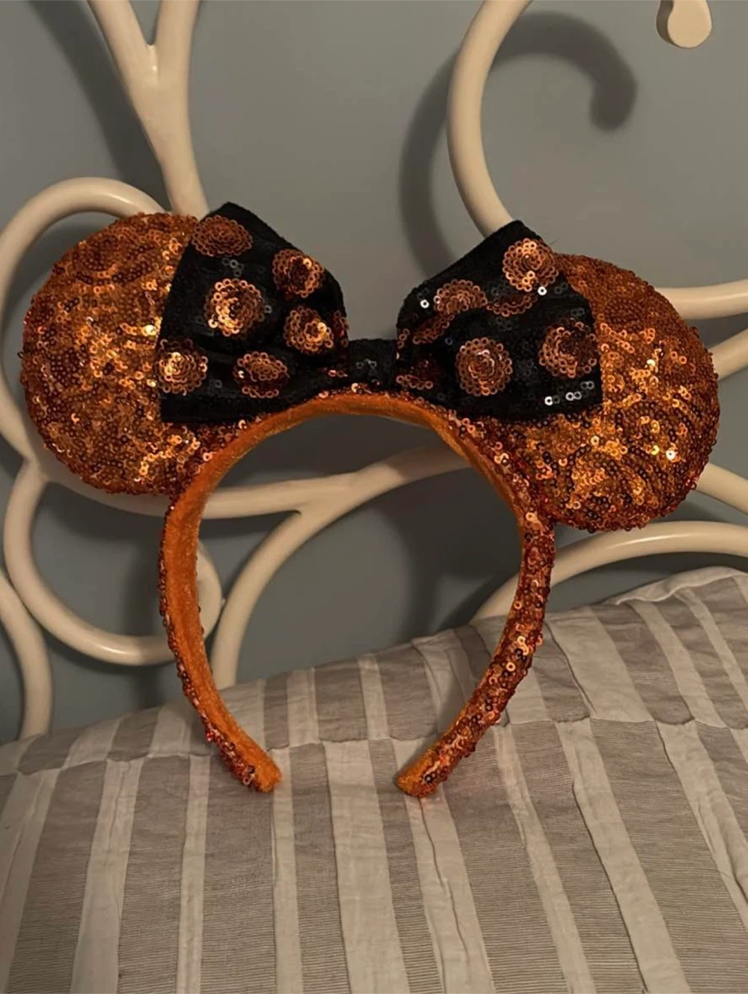 Sparkly orange sequin Minnie Mouse ears headband with a black bow adorned with sequin pumpkins. It's perfect for Halloween festivities or any Disney fan!