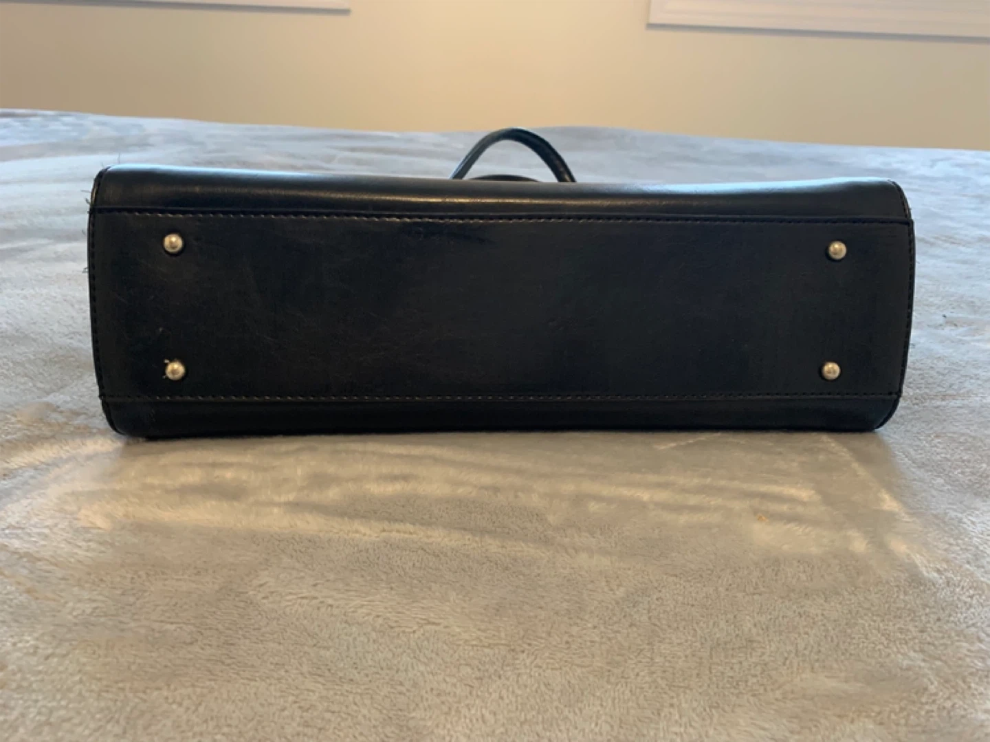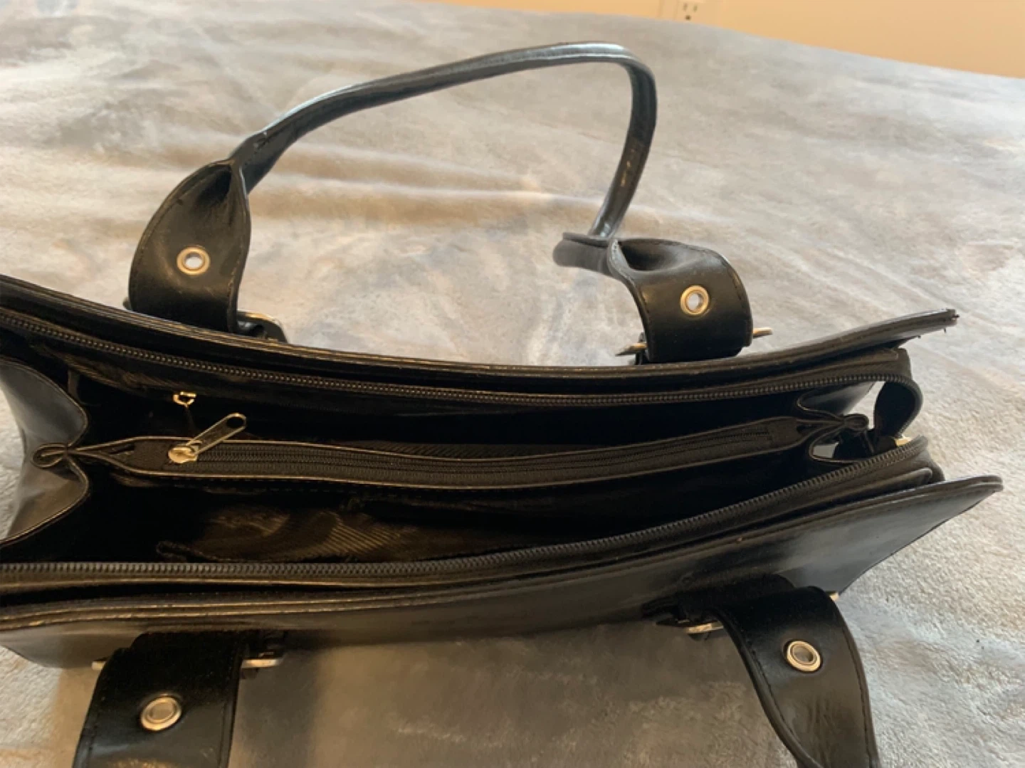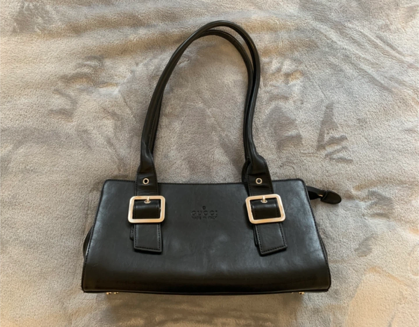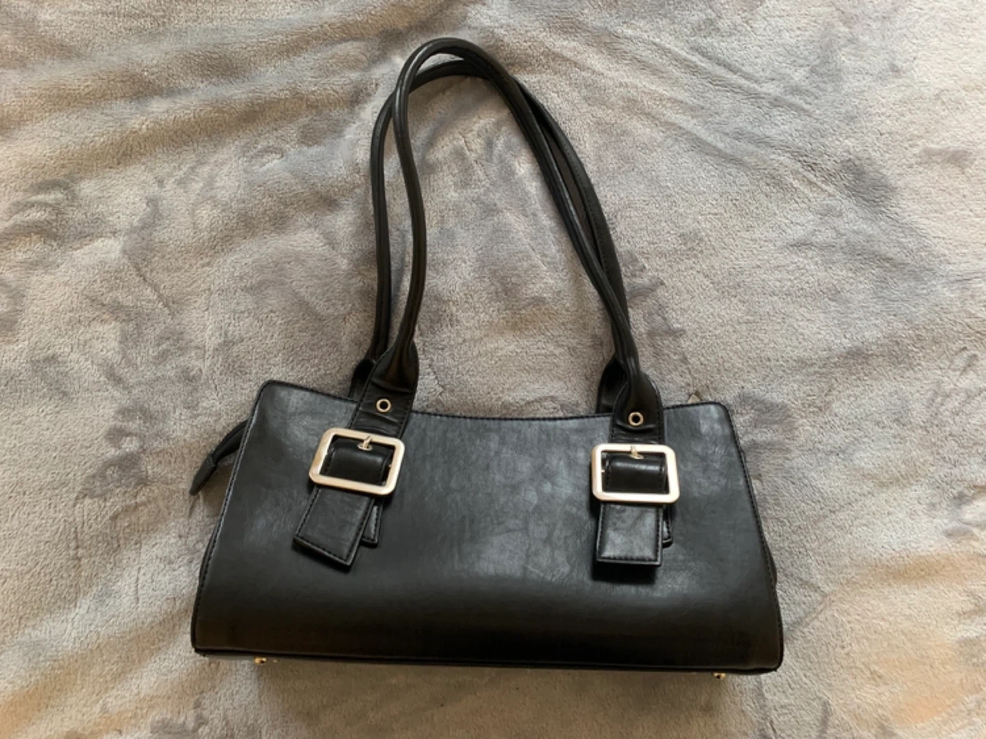 Designer inspired black shoulder bag features a faux leather exterior and silver buckle accents. It has multiple zippered compartments inside for organization. It's a classic style that's handy for everyday use!