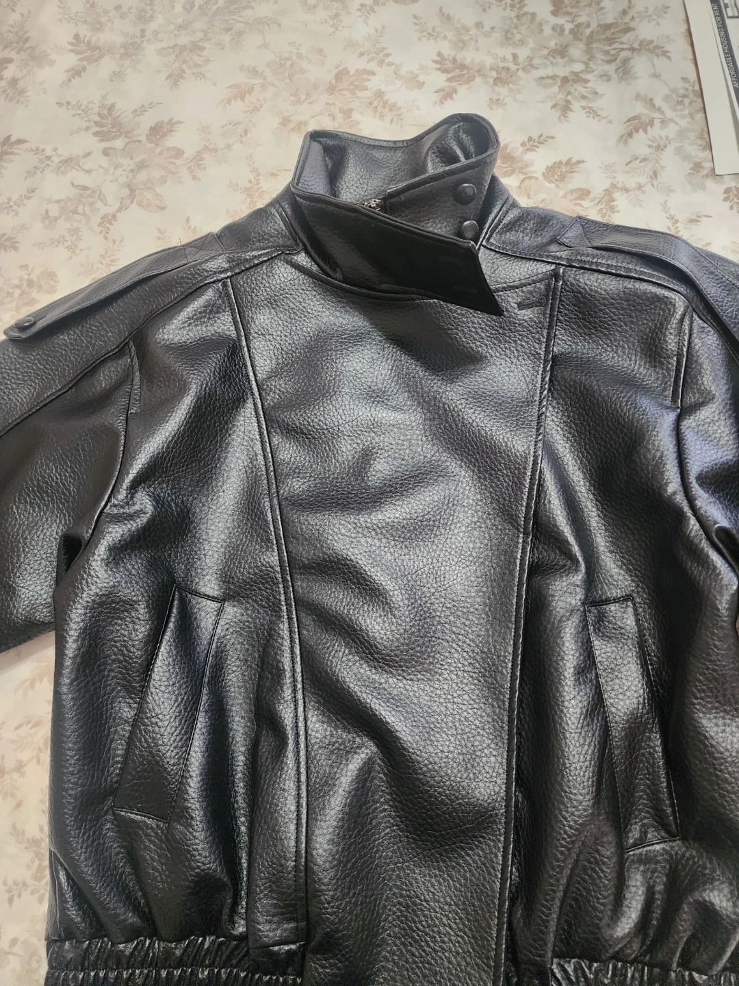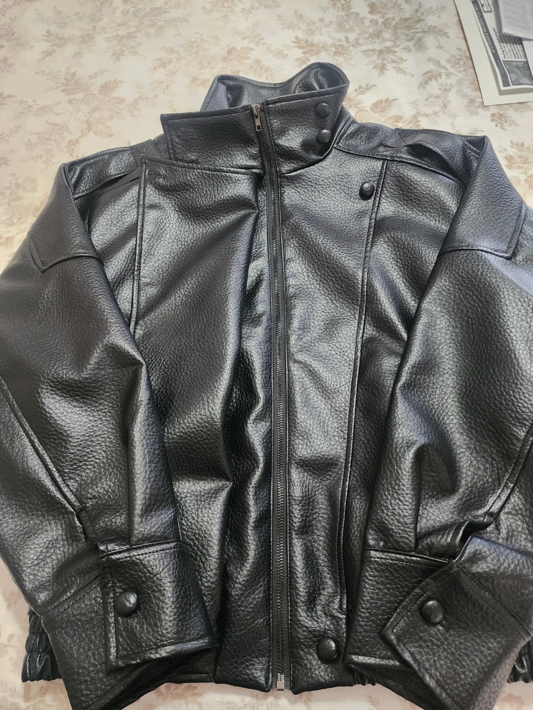Black faux leather jacket with a zip-up front and snap collar. Features include buttoned cuffs and an elasticated hem. Material is faux leather.