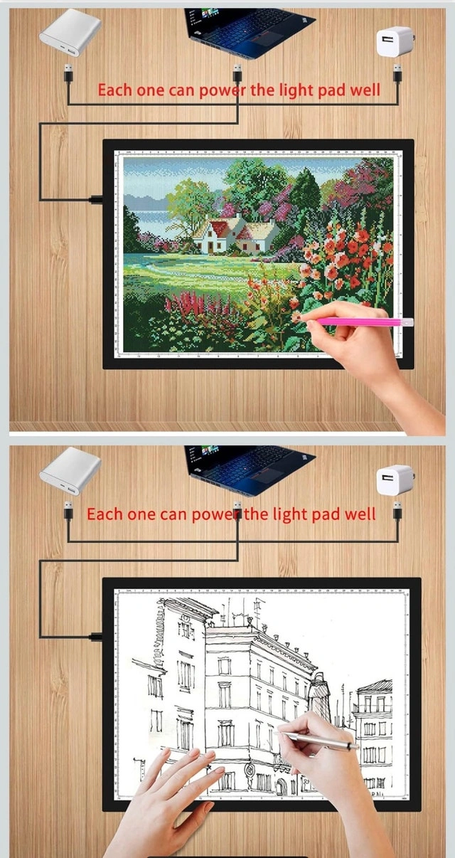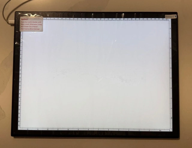 Super bright A3 LED light pad with USB connectivity. Has a sturdy frame and anti-slip pad design. Suitable for tracing, drawing, weeding vinyl, diamond painting, and more. 4500 Lux super bright, 9-level dimming, and stepless dimming. Can be powered via USB-C from a laptop or power bank.