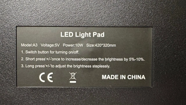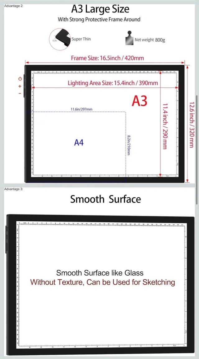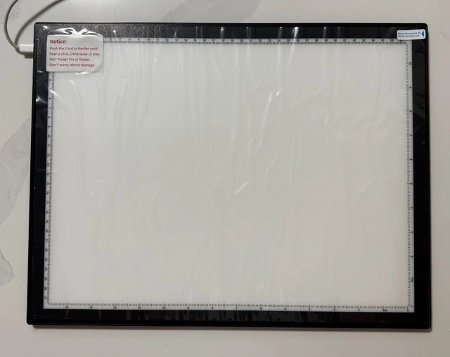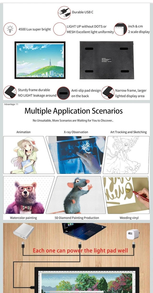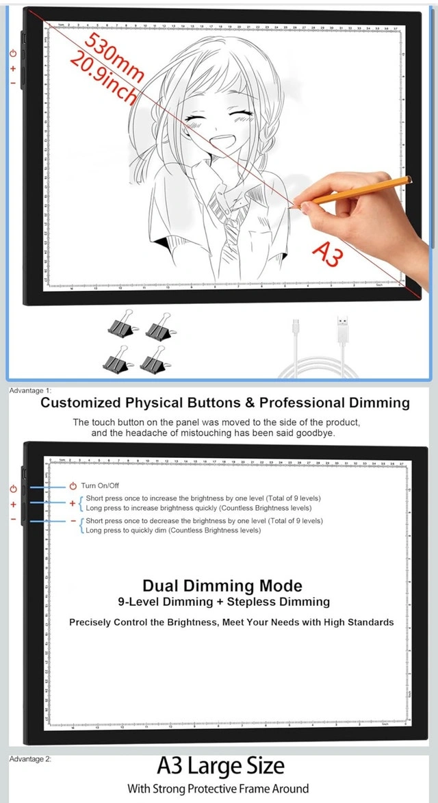 Super bright A3 LED light pad with USB connectivity. Has a sturdy frame and anti-slip pad design. Suitable for tracing, drawing, weeding vinyl, diamond painting, and more. 4500 Lux super bright, 9-level dimming, and stepless dimming. Can be powered via USB-C from a laptop or power bank.