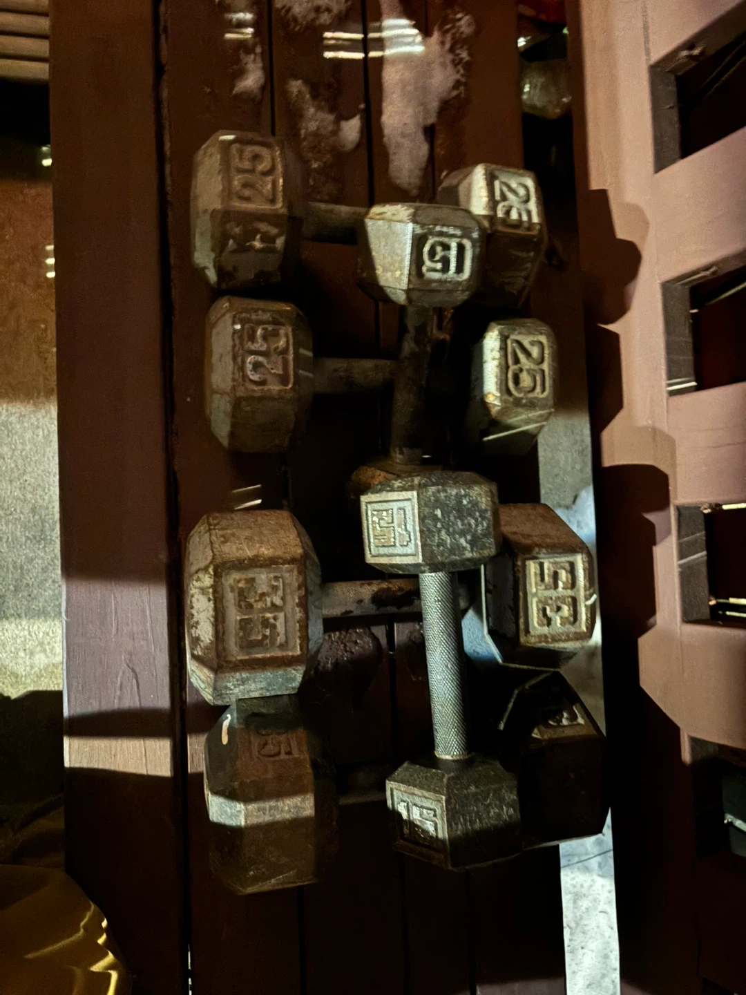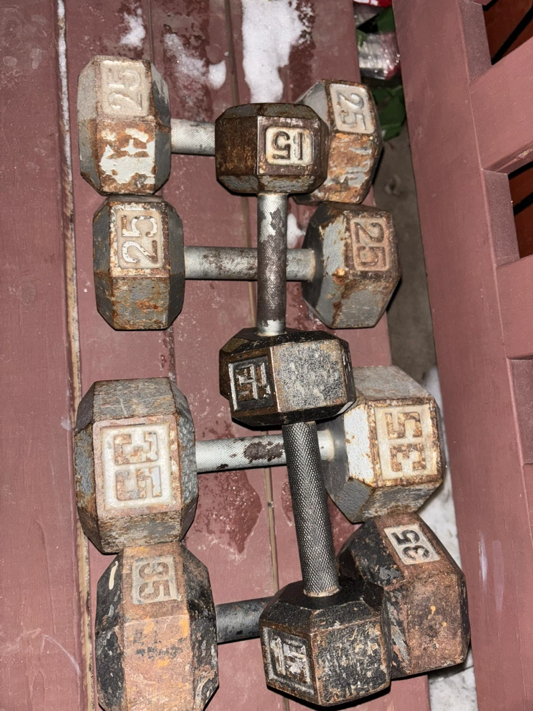 This is a set of dumbbells including 15 lb, 25 lb, and 35 lb pairs. They're made of cast iron with a textured grip handle. Priced to sell, offer
