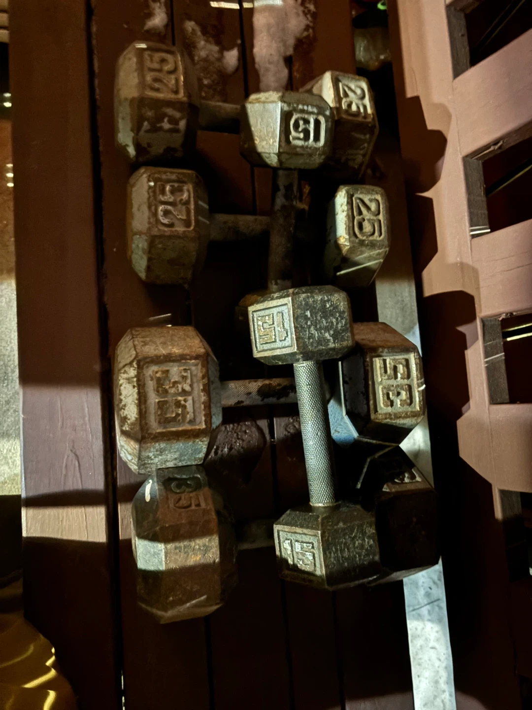This is a set of dumbbells including 15 lb, 25 lb, and 35 lb pairs. They're made of cast iron with a textured grip handle. Priced to sell, offer