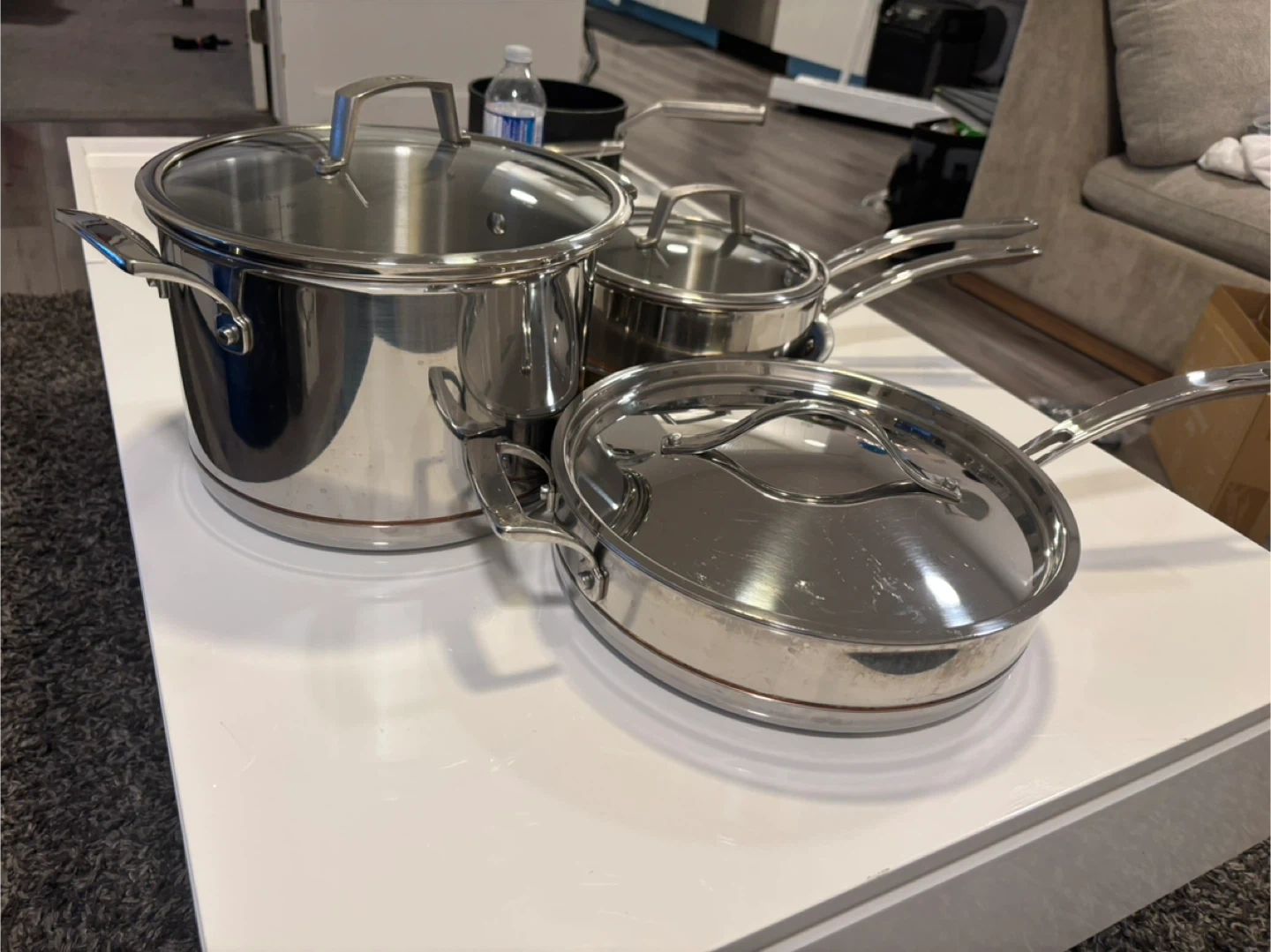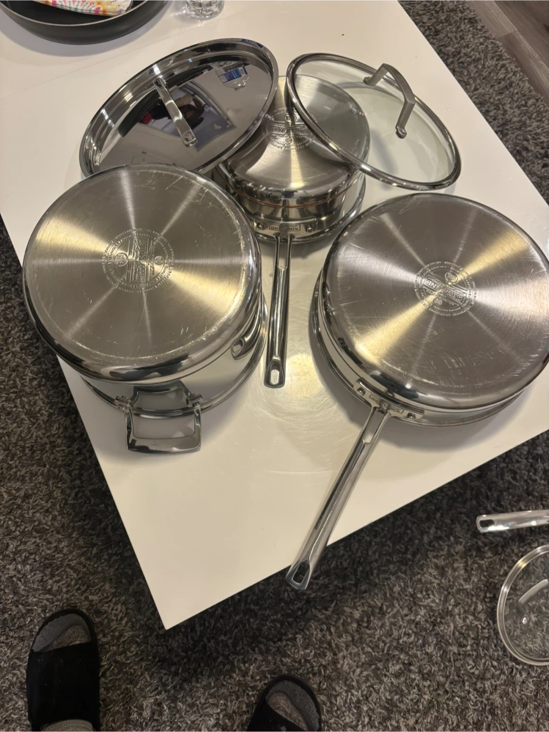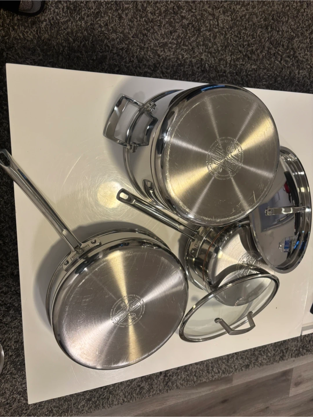 This is a set of All-Clad stainless steel pots and pans. It includes a large stockpot, a frying pan, and a saucepan, all with lids. They're made from durable stainless steel. 2 cover missing