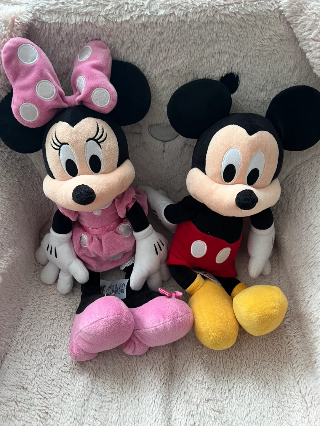 Two cute Disney plush toys featuring Mickey Mouse and Minnie Mouse. They're soft and cuddly, perfect for any Disney fan. Minnie is wearing her iconic pink polka dot dress and bow. One bow on Minnie shoe missing. In excellent condition otherwise