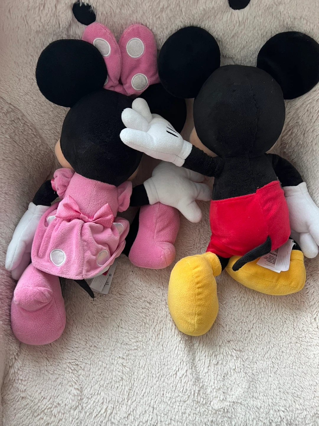 Two cute Disney plush toys featuring Mickey Mouse and Minnie Mouse. They're soft and cuddly, perfect for any Disney fan. Minnie is wearing her iconic pink polka dot dress and bow. One bow on Minnie shoe missing. In excellent condition otherwise