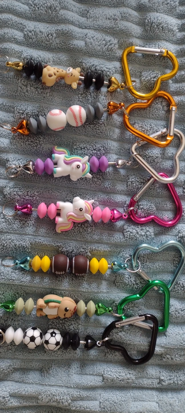 $4 Each.Little Boys, Girls, and unisex keychain charms Keyholders featuring different themes like unicorns, sports, and animals. Each charm is strung with colourful beads and includes a sturdy carabiner clip. These are great for adding a bit of personality to backpacks or keys!