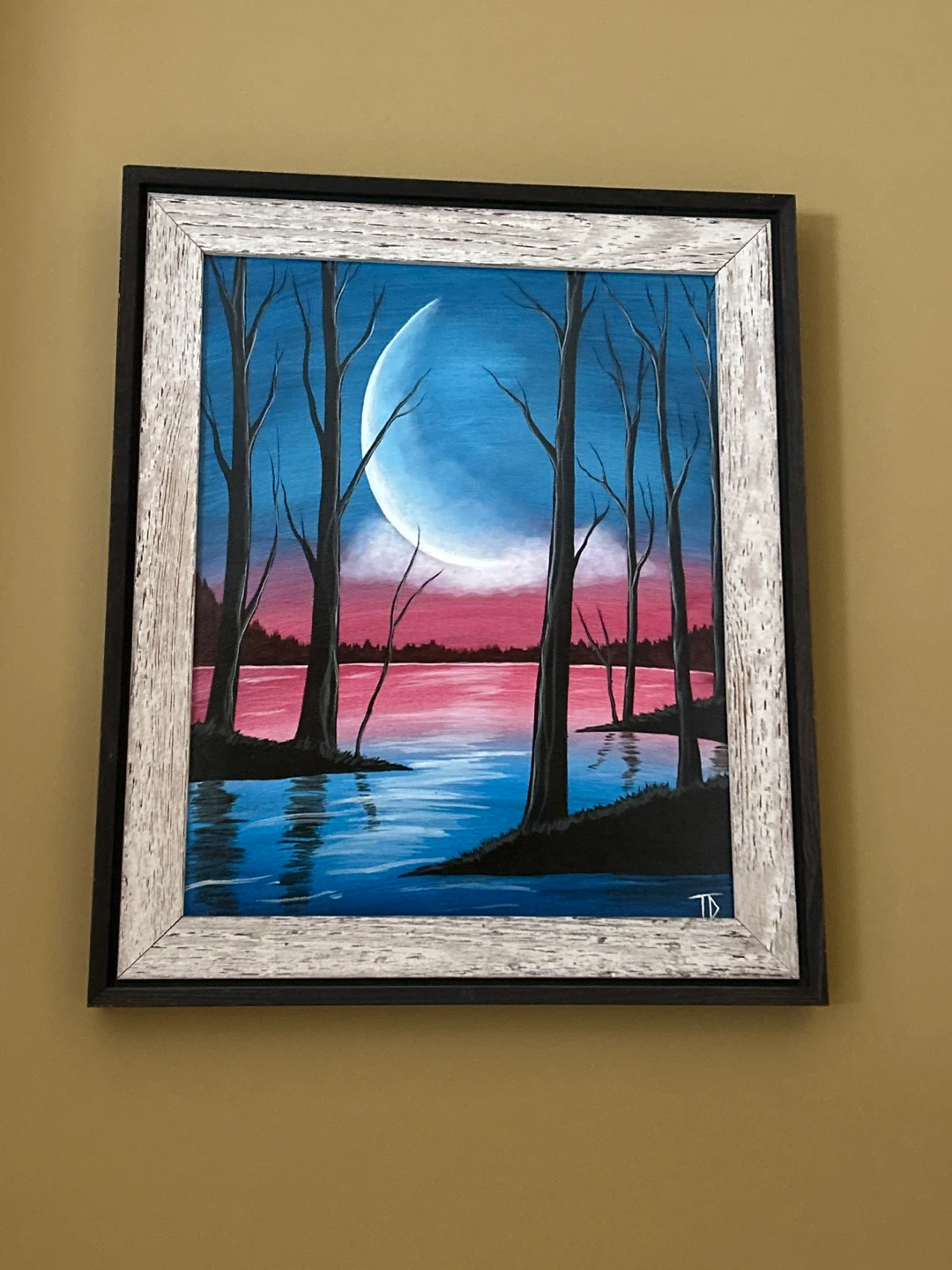 Beautiful acrylic painting of a serene moonlit lake scene with trees. It's framed and ready to hang. The artwork features vibrant blues and pinks for a striking contrast.