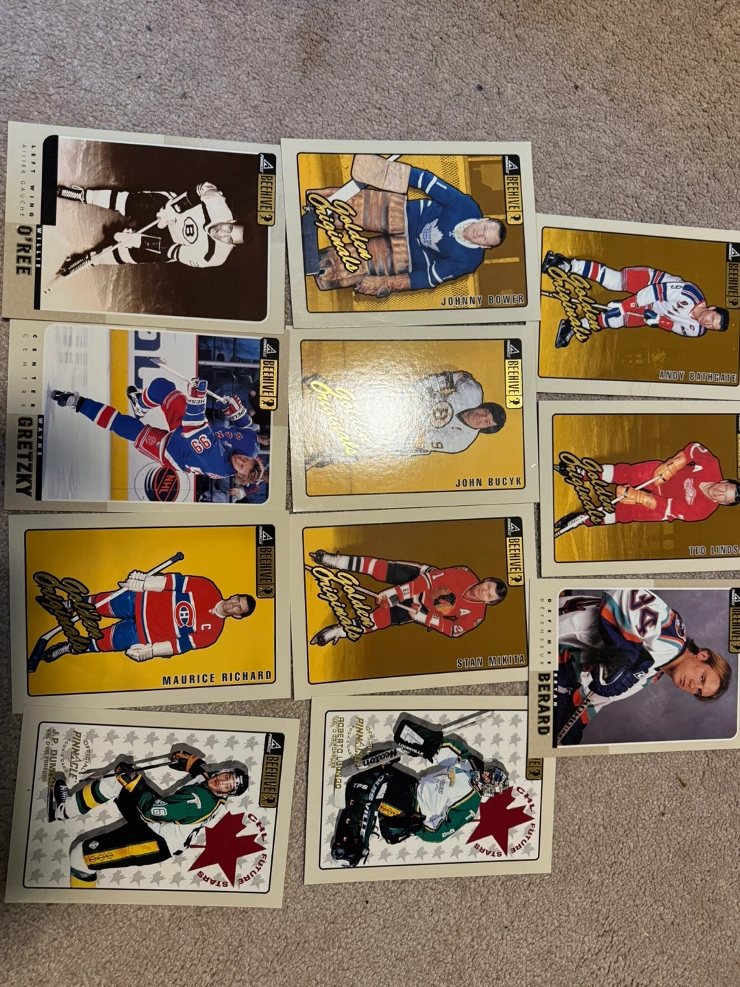 A collection of Pinnacle Beehive hockey cards featuring "Golden Originals". Includes cards for Johnny Bower, Maurice Richard, Willie O'Ree, and more.