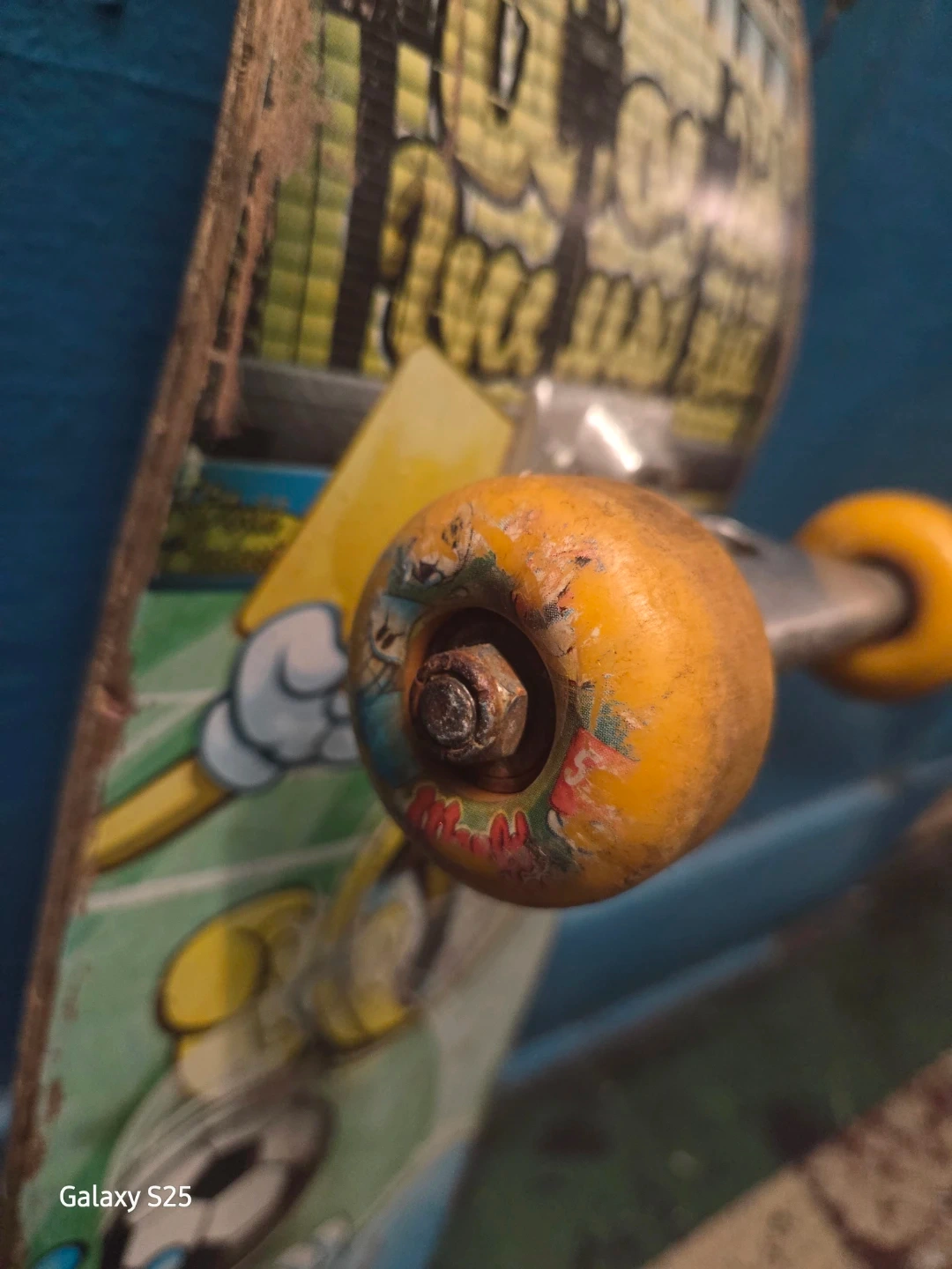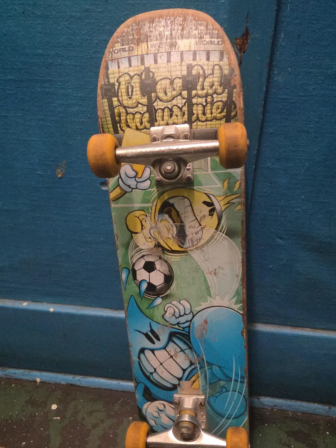 This is a used skateboard featuring colourful cartoon graphics. It has yellow wheels and standard metal trucks. The deck shows signs of wear and tear, consistent with regular use.
