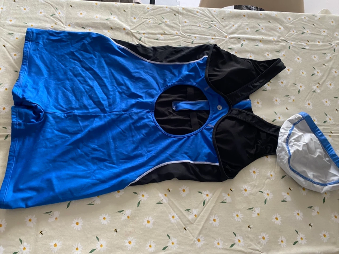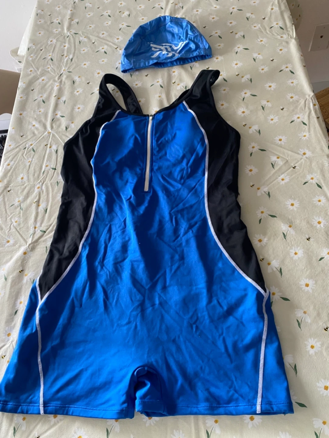 Swimsuit with matching cap, perfect for swimming lessons or fun at the pool! The swimsuit is blue and black with white trim.
