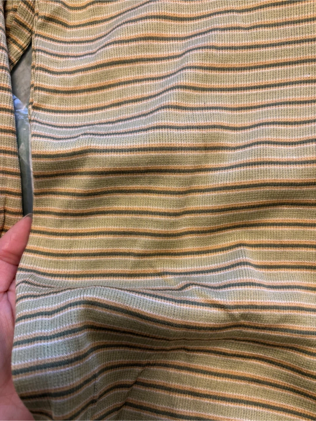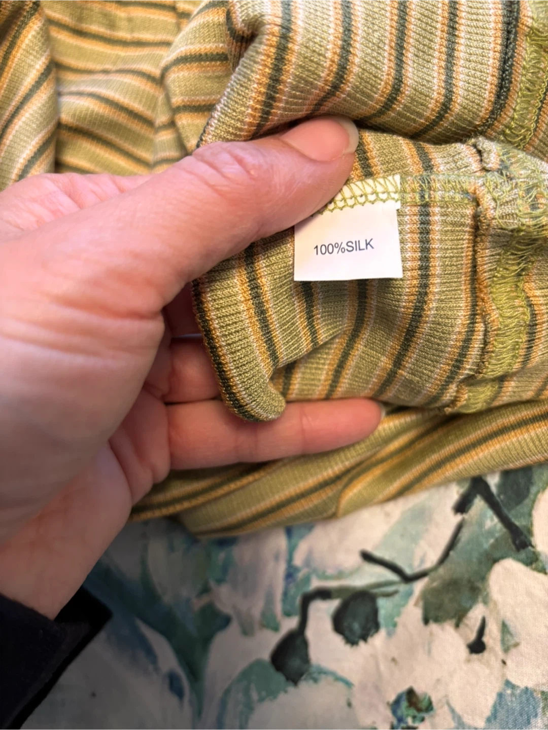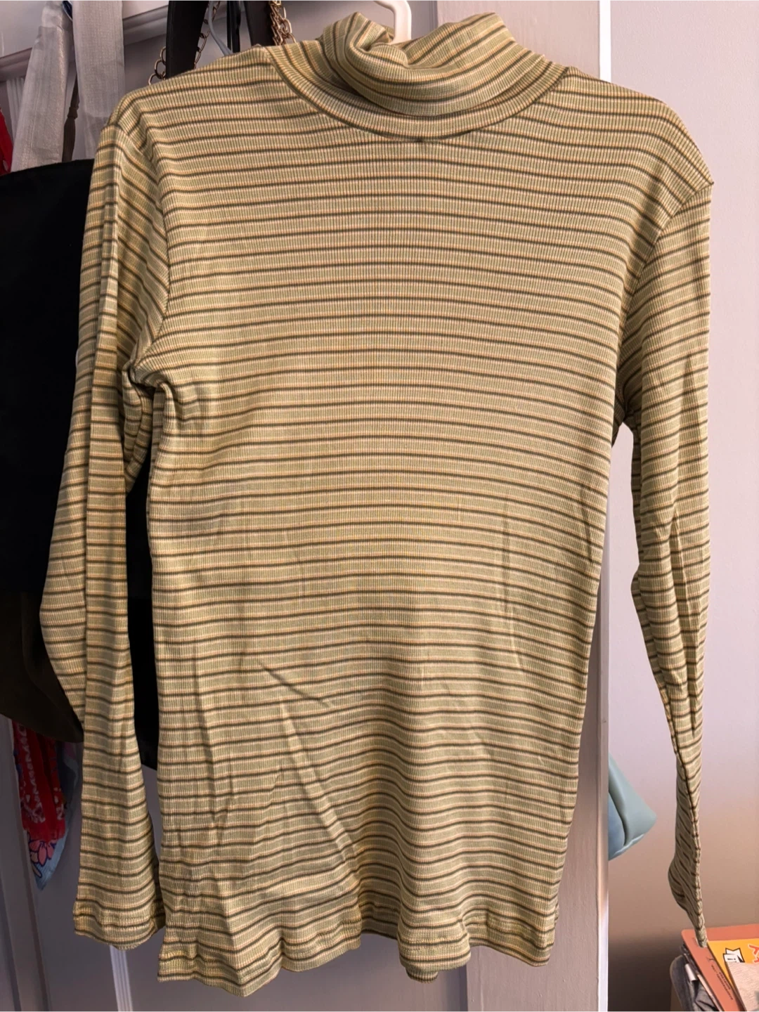 Here's a cute striped turtleneck top made of 100% silk! It's got a lovely soft feel and a unique look with its horizontal stripes. Highly stretchy, fit most.