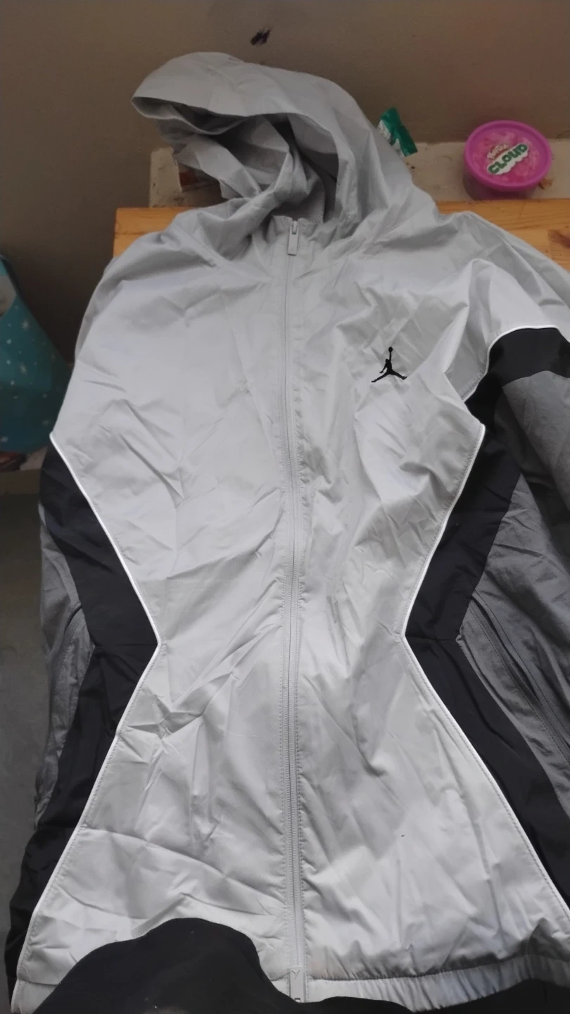This is a grey Jordan windbreaker jacket. It features the Jumpman logo on the chest. It's a lightweight jacket with a hood and full zip closure.