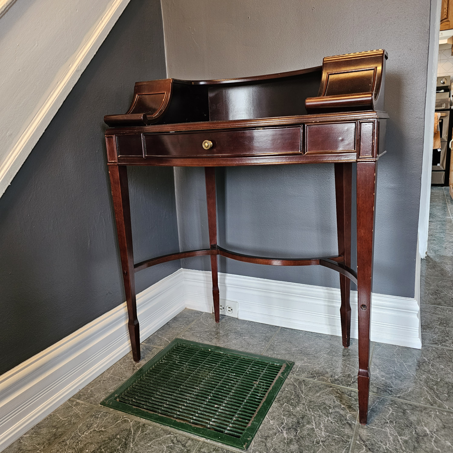 Dark brown wood. Secretary writing desk. Features a curved front and a single drawer with two side storage areas. Leather writing surface. Good condition. Perfect for a hallway or small space.