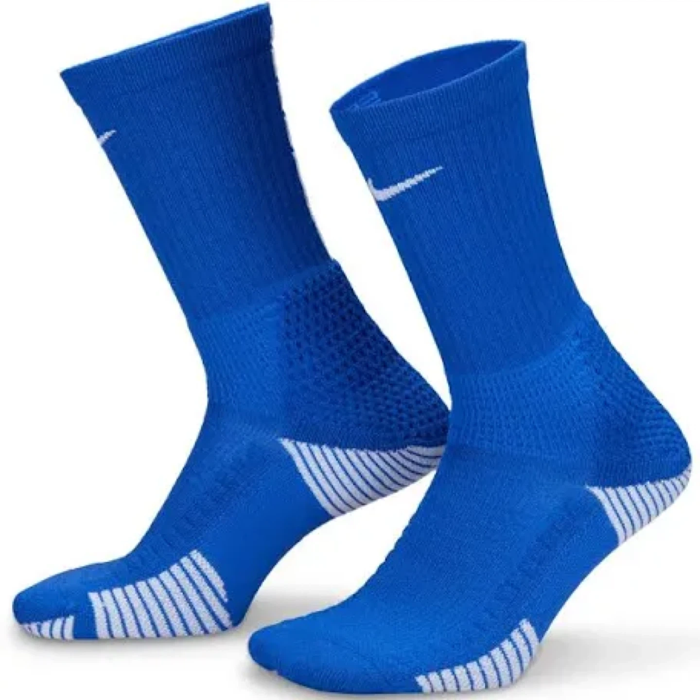 A pair of bright blue Nike crew socks. They feature the iconic Nike swoosh logo on the side. These socks are made for athletic wear.