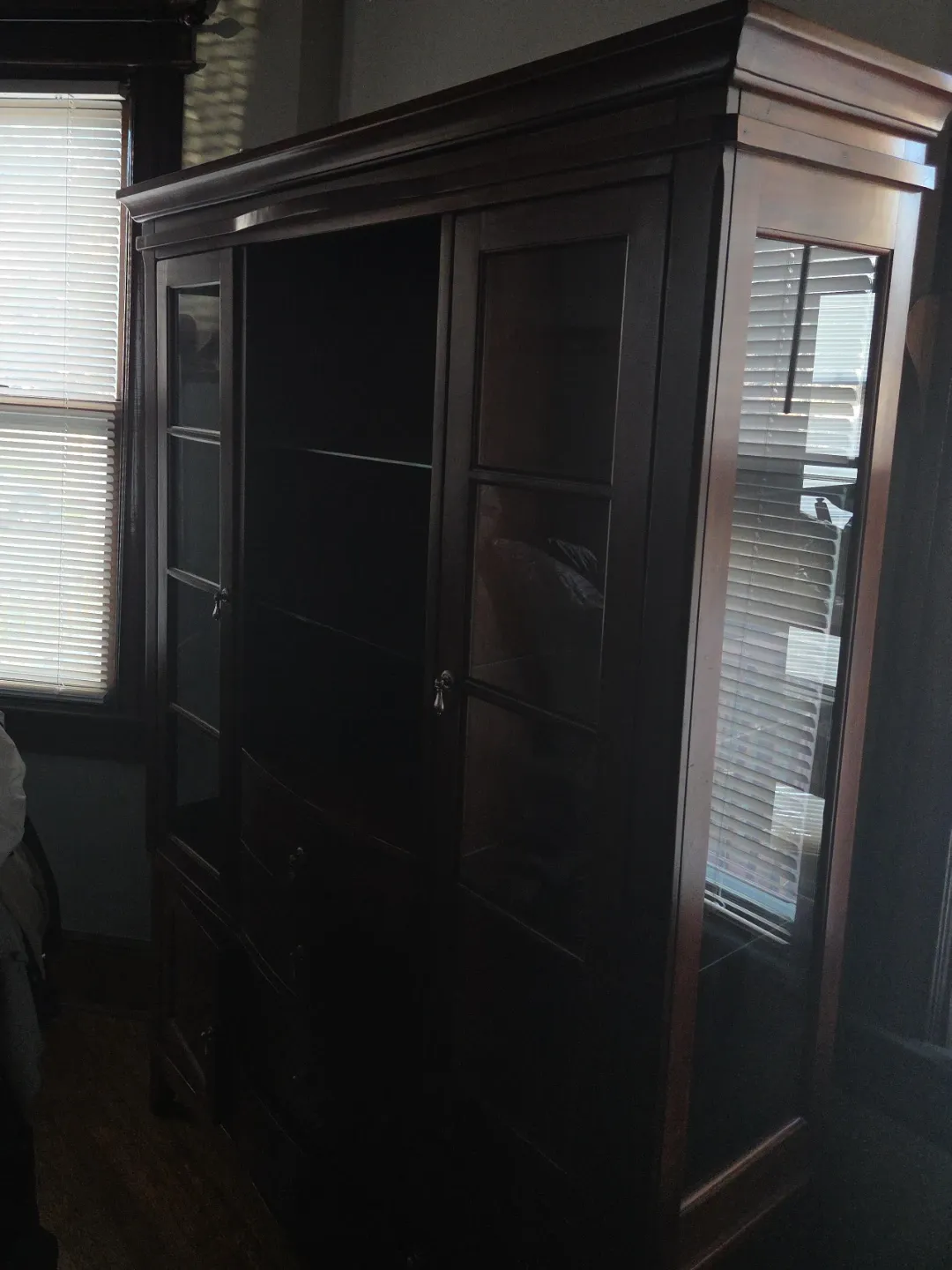 Dark wood china cabinet with glass doors and shelves. Features multiple drawers on the bottom. It's a substantial piece for display or storage. Great for a dining room or living area!