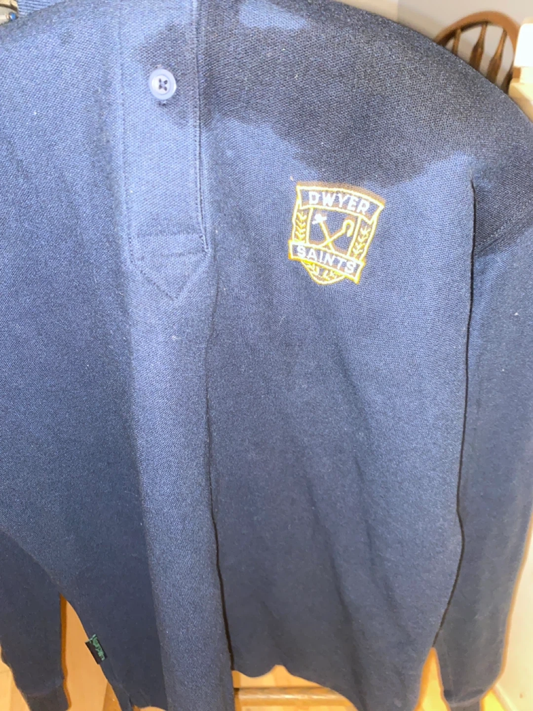 23I'm selling a navy blue polo shirt from McCarthy. It features a Dwyer Saints logo. The size is small.