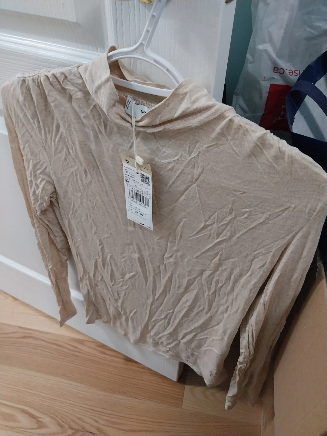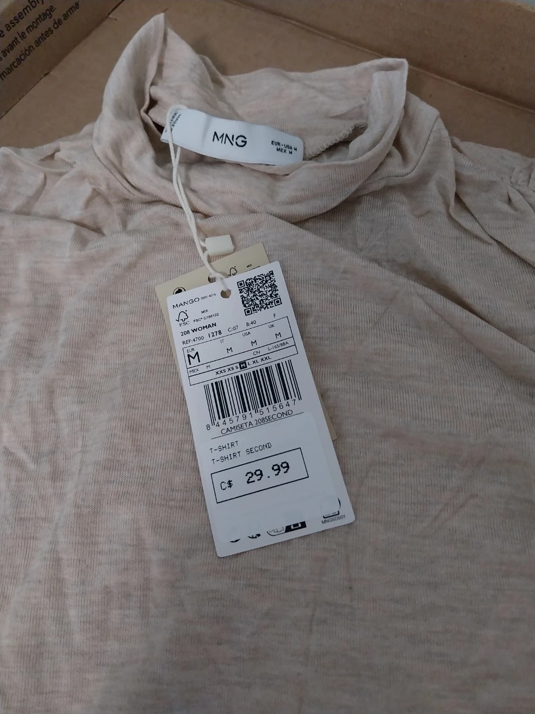 This is a beige, long-sleeved turtleneck t-shirt from Mango. It's a size medium and made from a soft fabric blend. It would be a nice staple for any wardrobe.