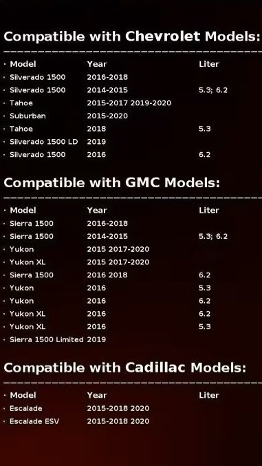 • Silverado 1500: 2014-2015 (5.3L, 6.2L), 2016-2018