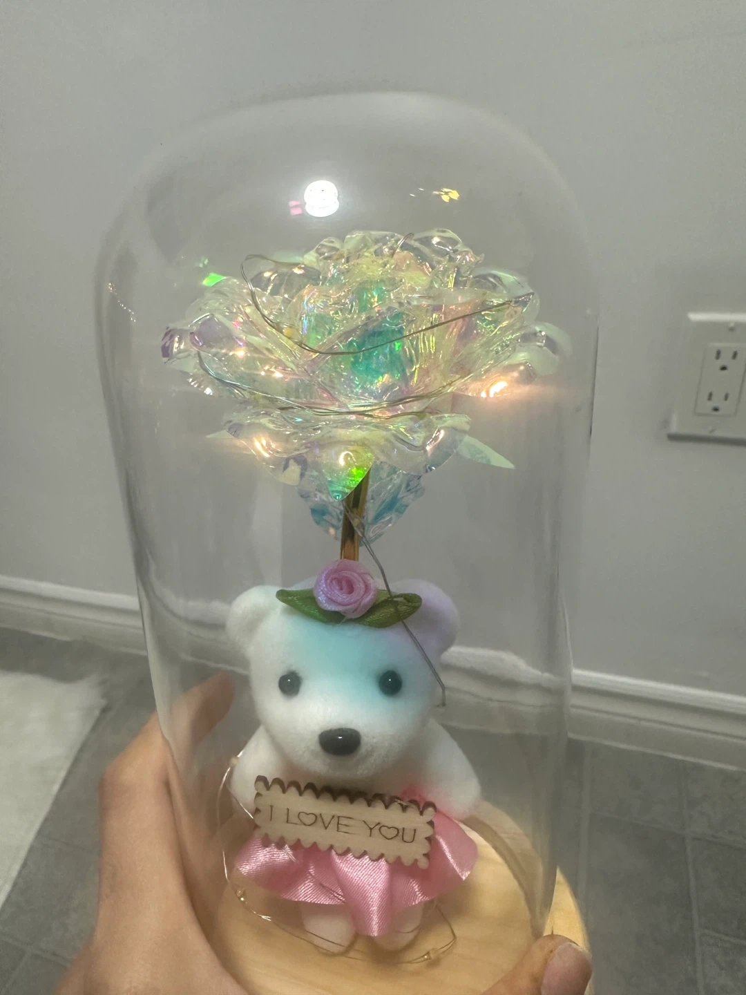 Surprise your special someone with our rose teddy bear encased in a glass dome with twinkling lights. Adorably romantic and charming, it doubles as a stunning room decoration that will melt hearts! Price is negotiable.