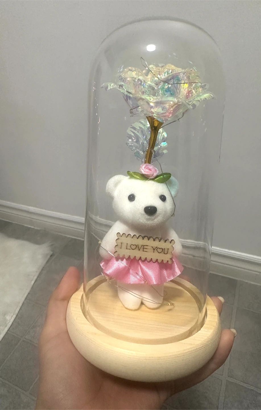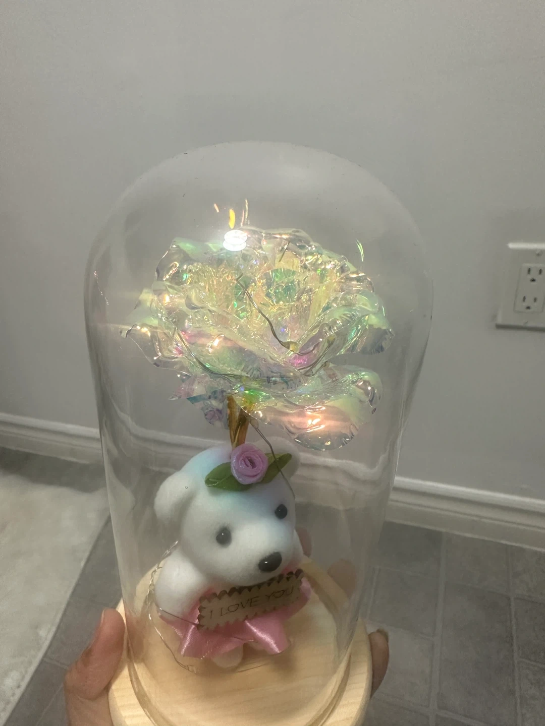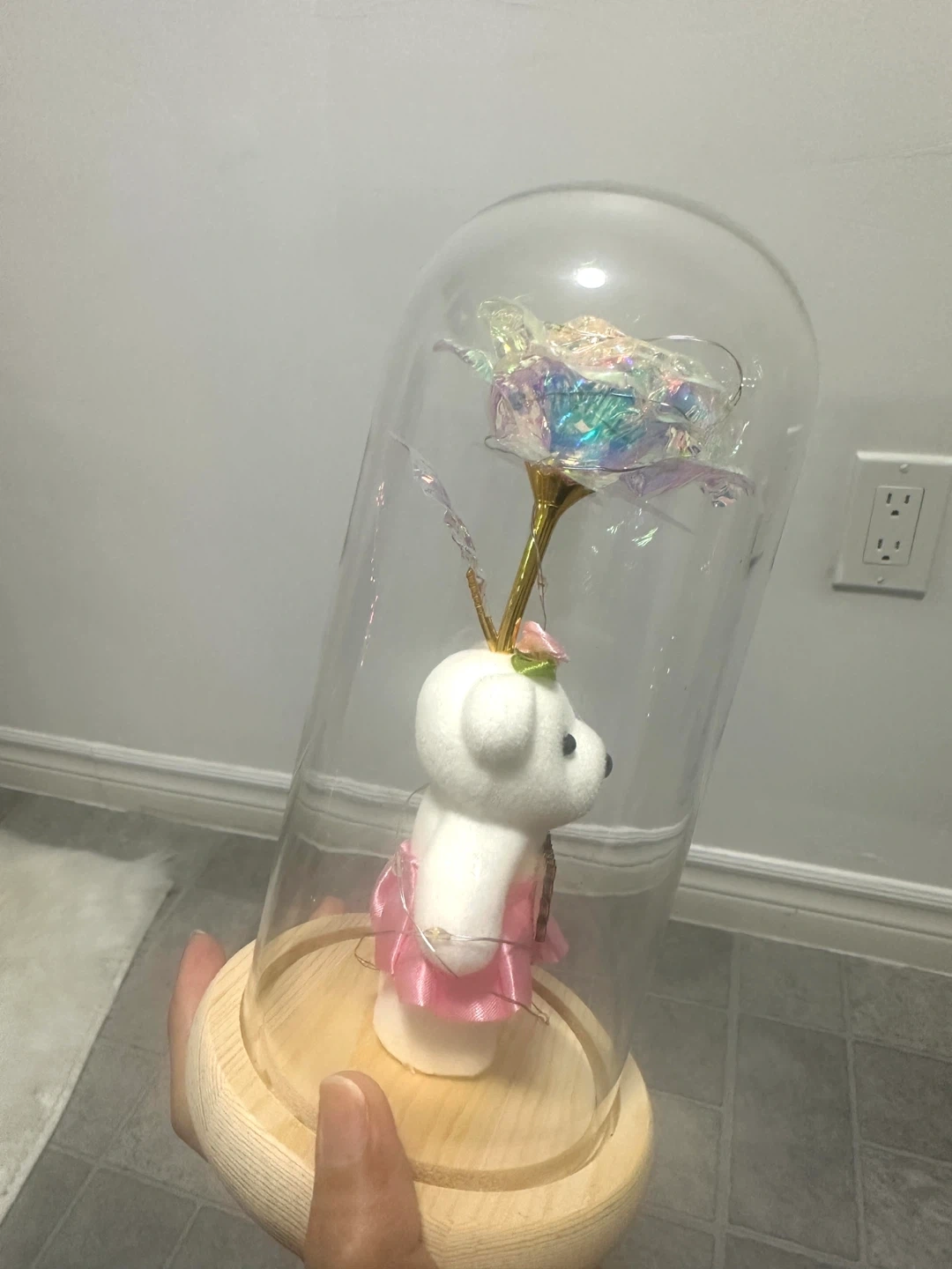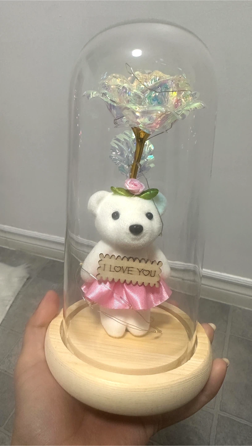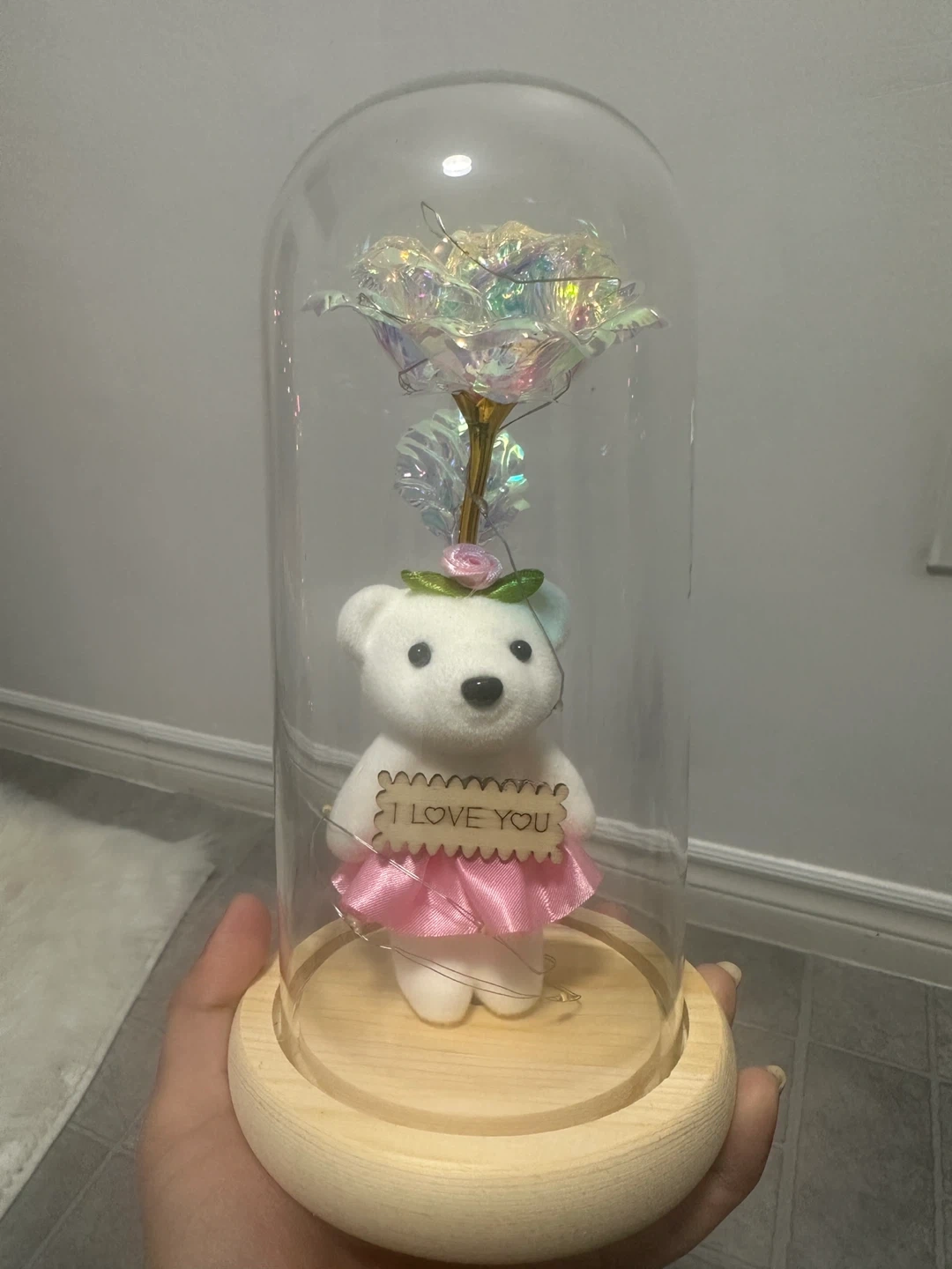 Surprise your special someone with our rose teddy bear encased in a glass dome with twinkling lights. Adorably romantic and charming, it doubles as a stunning room decoration that will melt hearts! Price is negotiable.