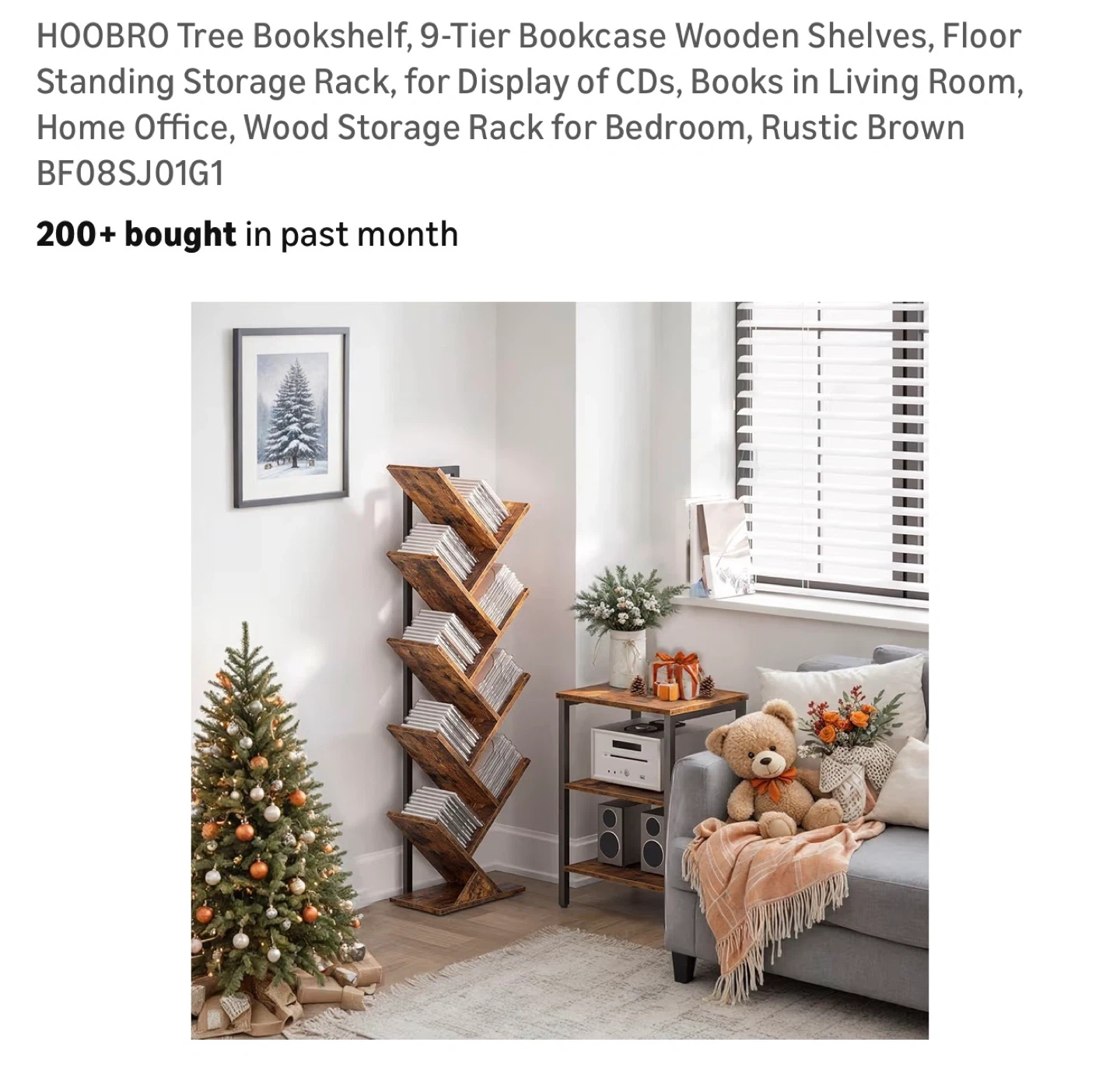 This HOOBRO tree bookshelf features a unique design with 9 tiers for displaying books or CDs. Made from wood and metal, it's a stylish storage rack. It's great for use in living rooms or bedrooms. The dimensions are 44.0" x 25.0" x 17.5".