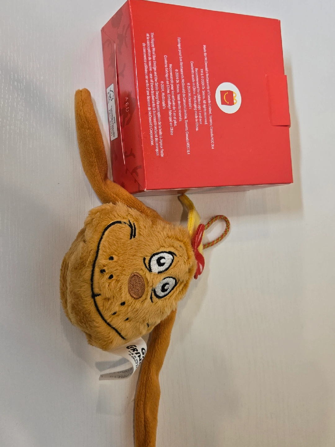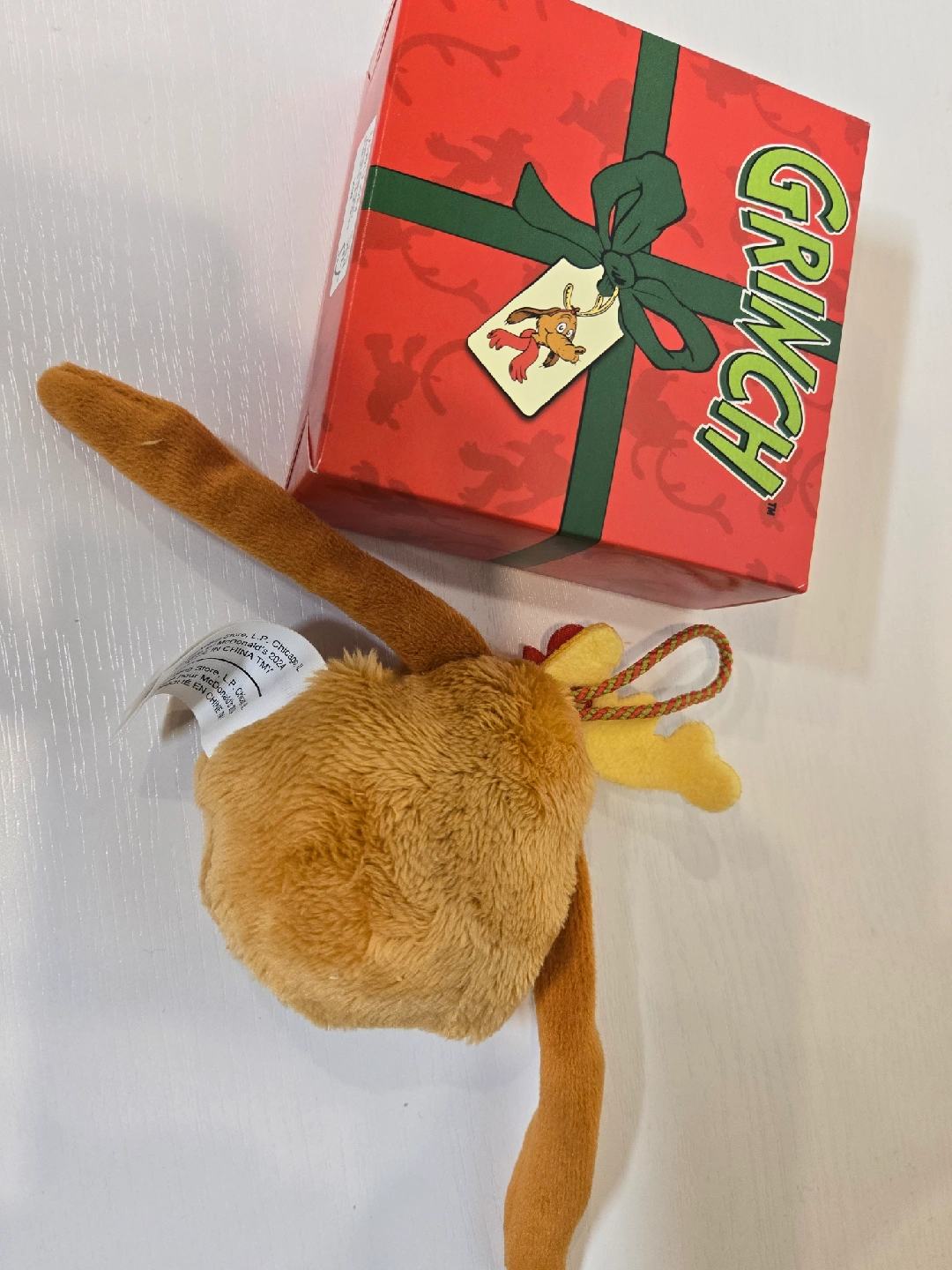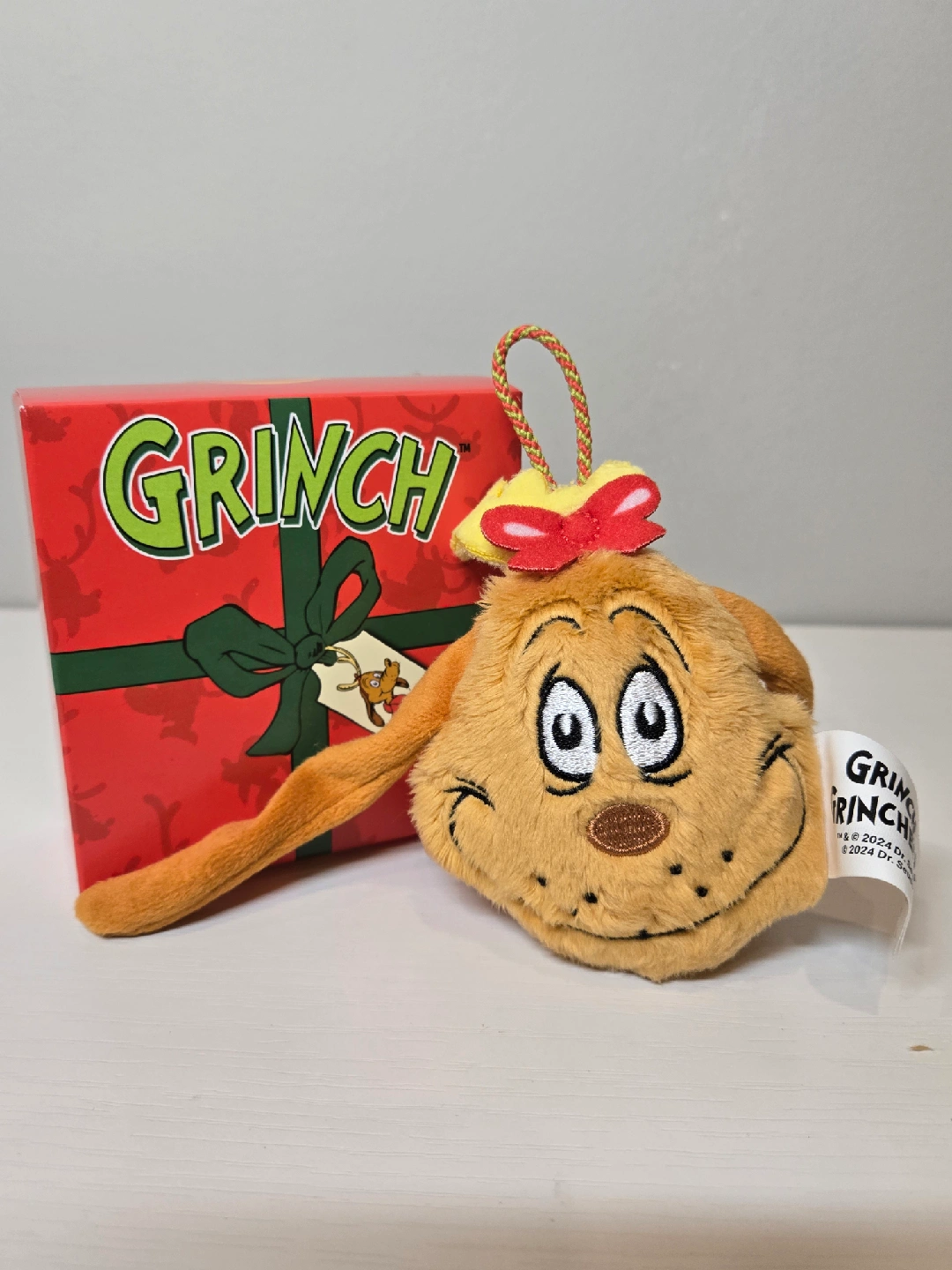 Selling a cute Max the Dog plush ornament from the Grinch movie! It's a McDonald's promo item and comes with its original box. The tag says it was manufactured in 2024 June 01. It's in great condition and ready to hang on your tree