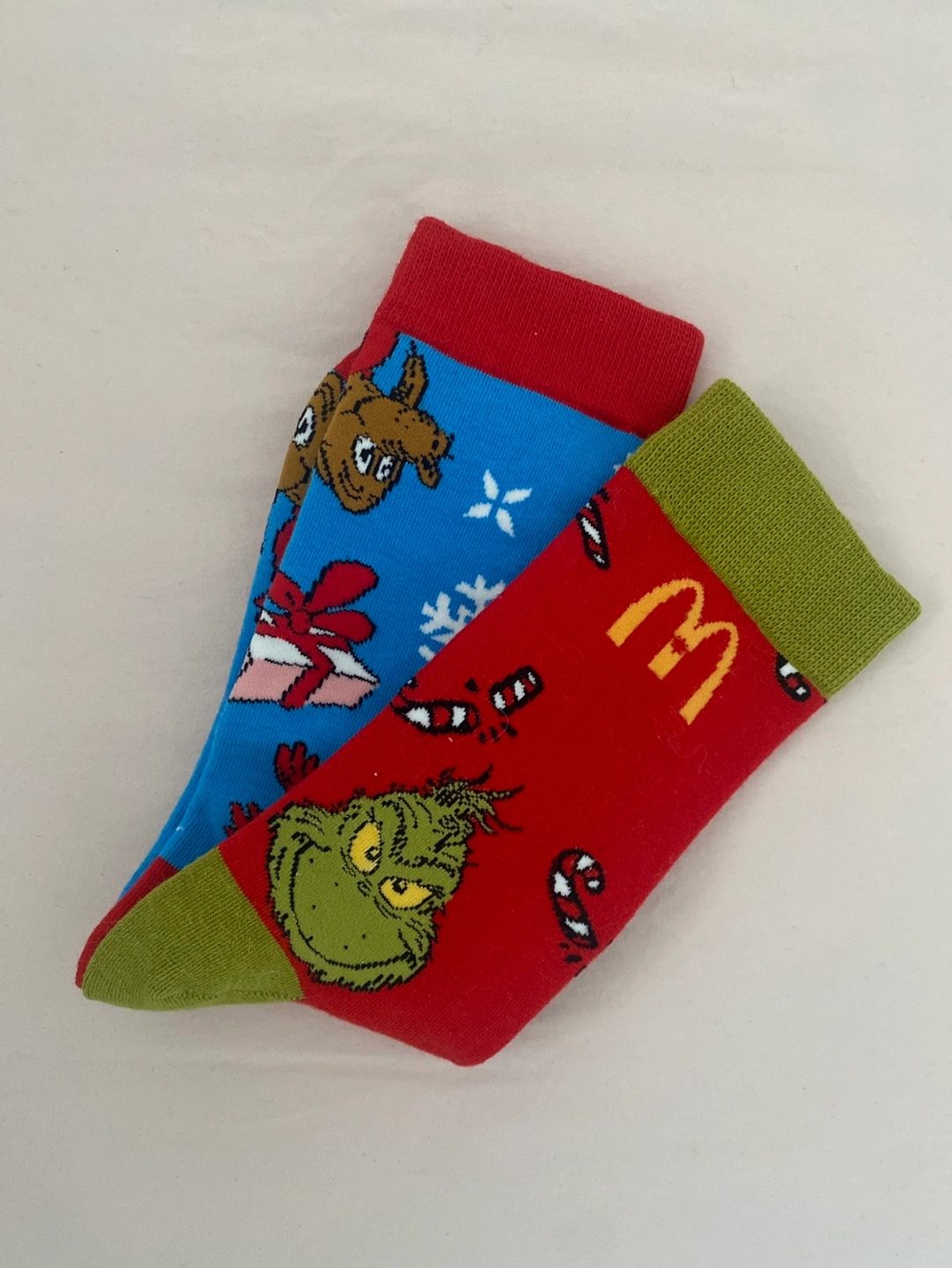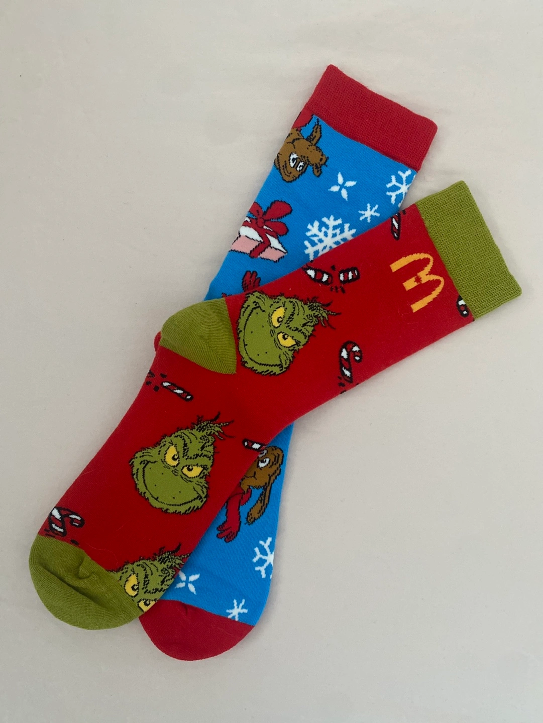 40Features The Grinch and Max. One sock red, other blue with McDonald’s logo. Unworn