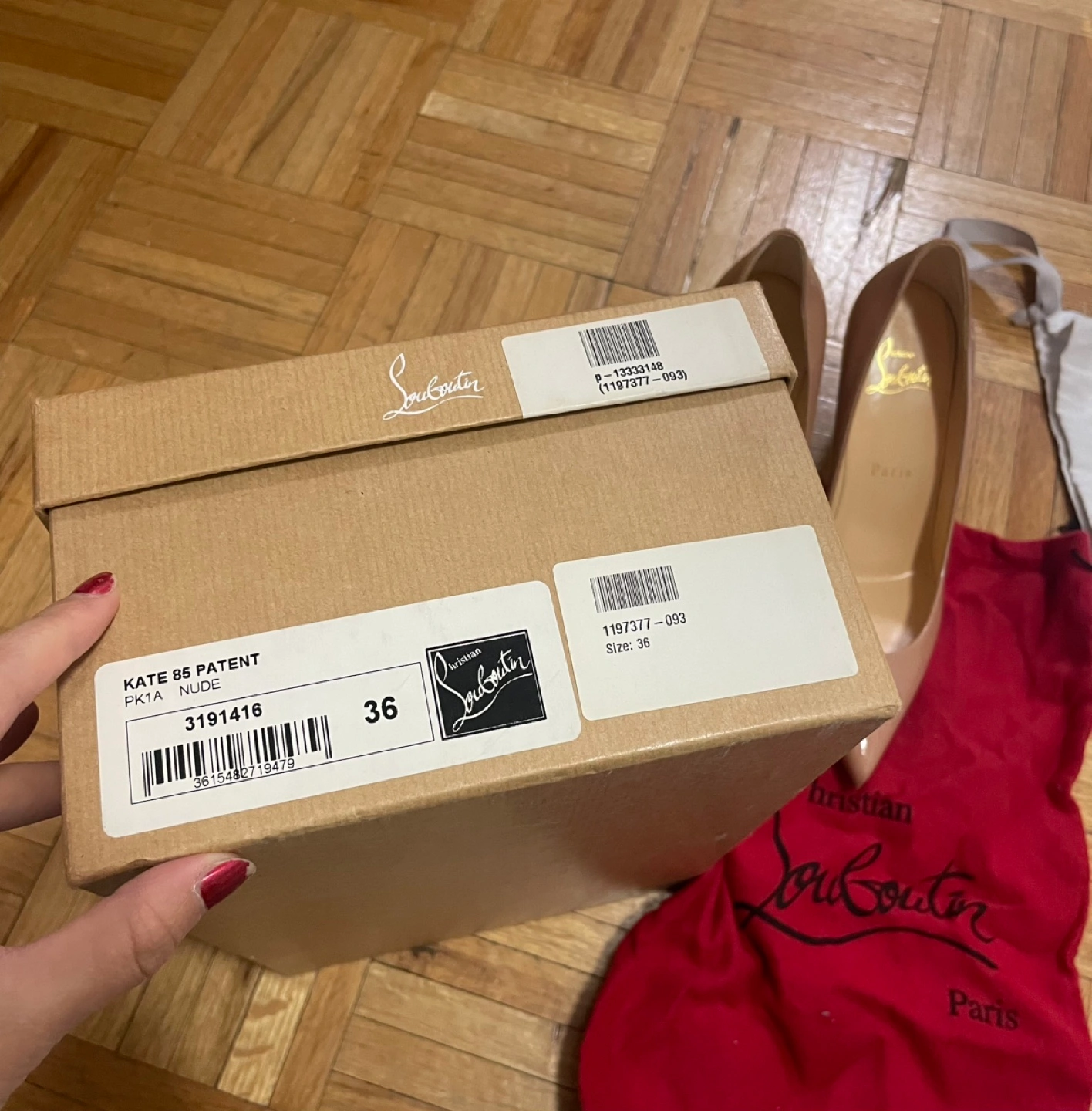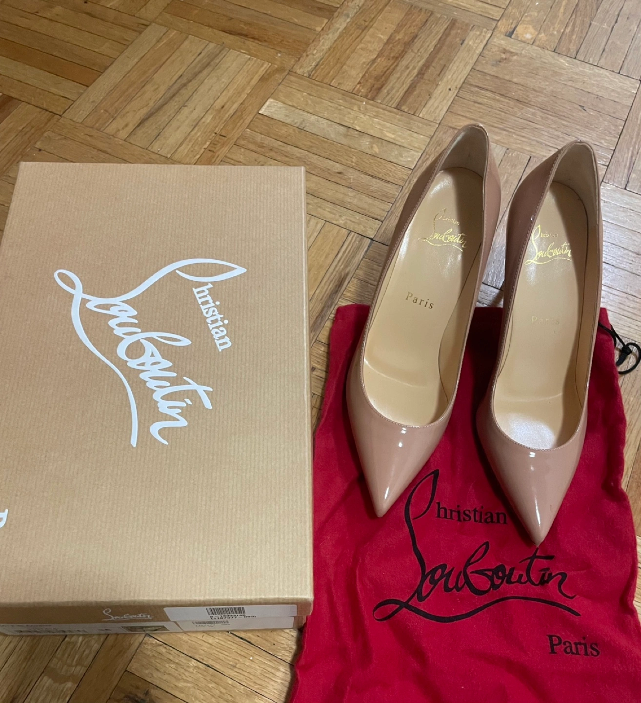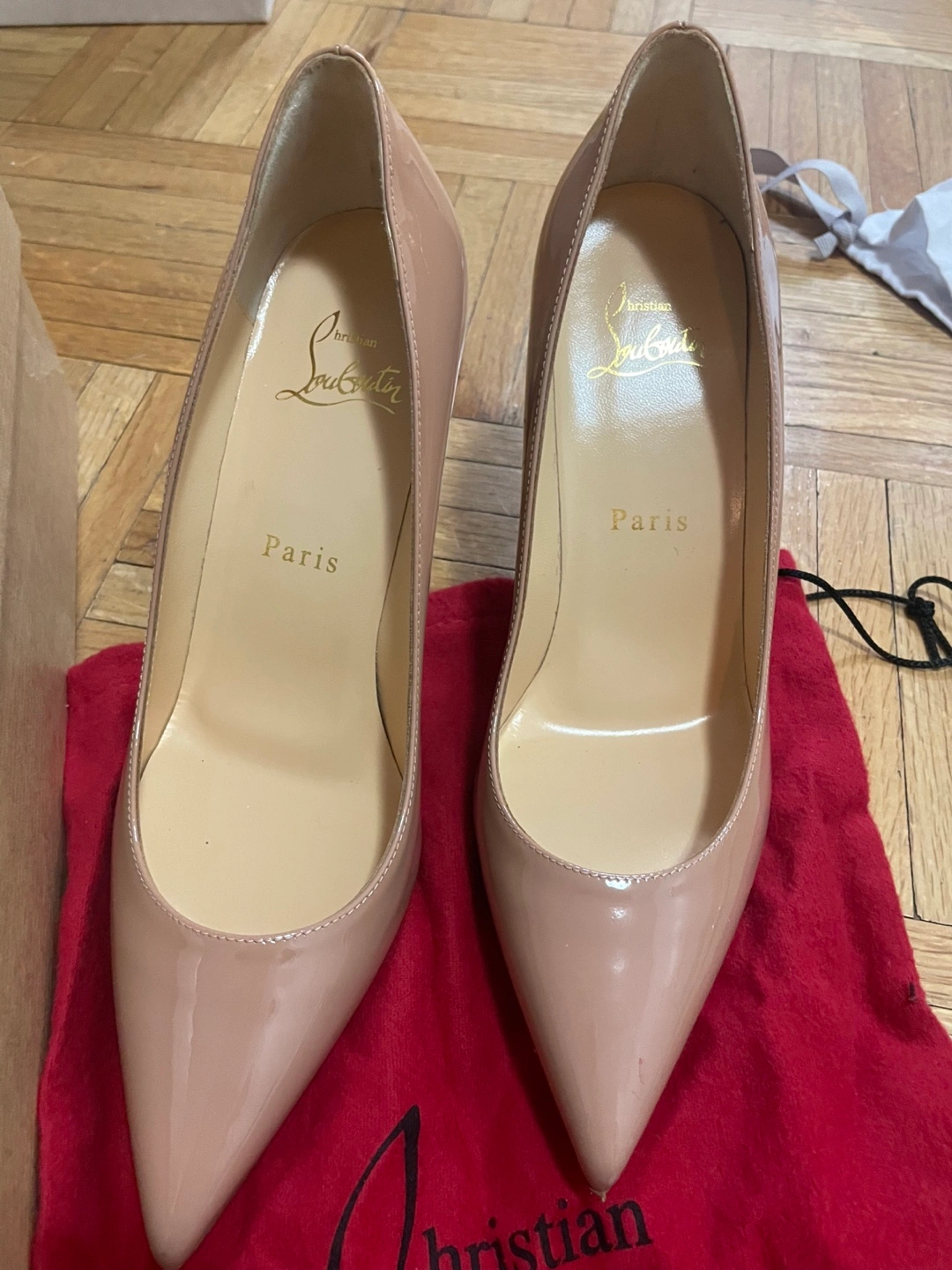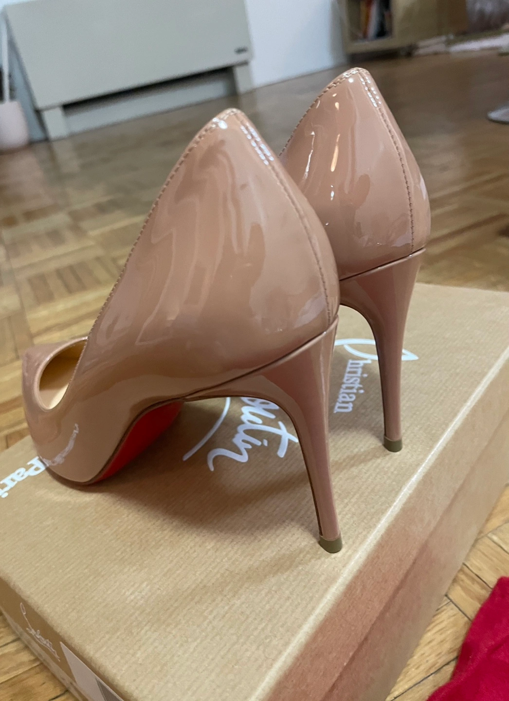 Nude patent leather pumps, size 36, come with original box and dust bag.