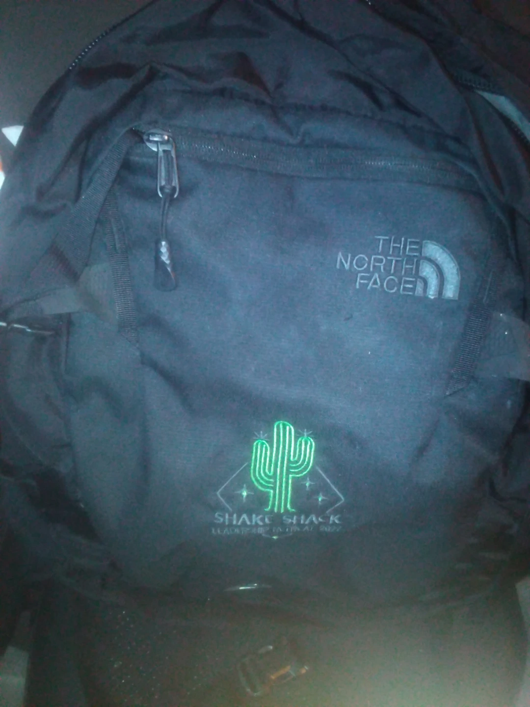 This black The North Face backpack features a unique Shake Shack cactus graphic. It includes FlexVent technology for comfortable wear. Multiple compartments offer ample storage space.