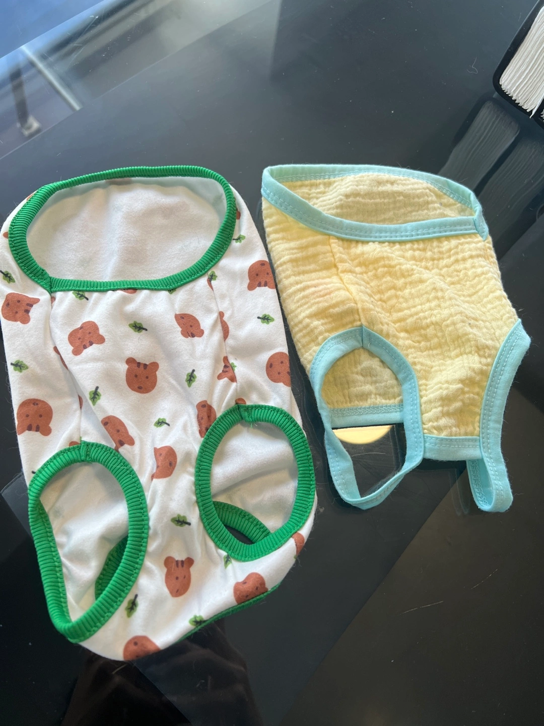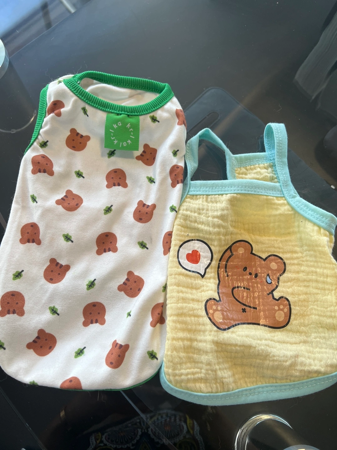 Selling a set of two adorable dog/cat t-shirts! One is white with a bear and leaf pattern, and the other is a soft yellow with a bear design. Perfect for keeping your furry friend comfy and stylish!